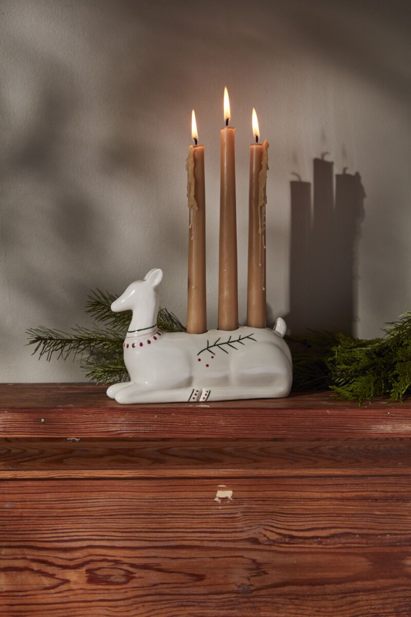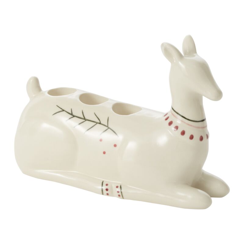 Set an inviting table with a peaceful, natural scene. The vintage-inspired, hand-painted stoneware Alise candle holder features a resting deer with red & green details & 3 standard taper candle openings. Pair with the matching dove tealight holder.