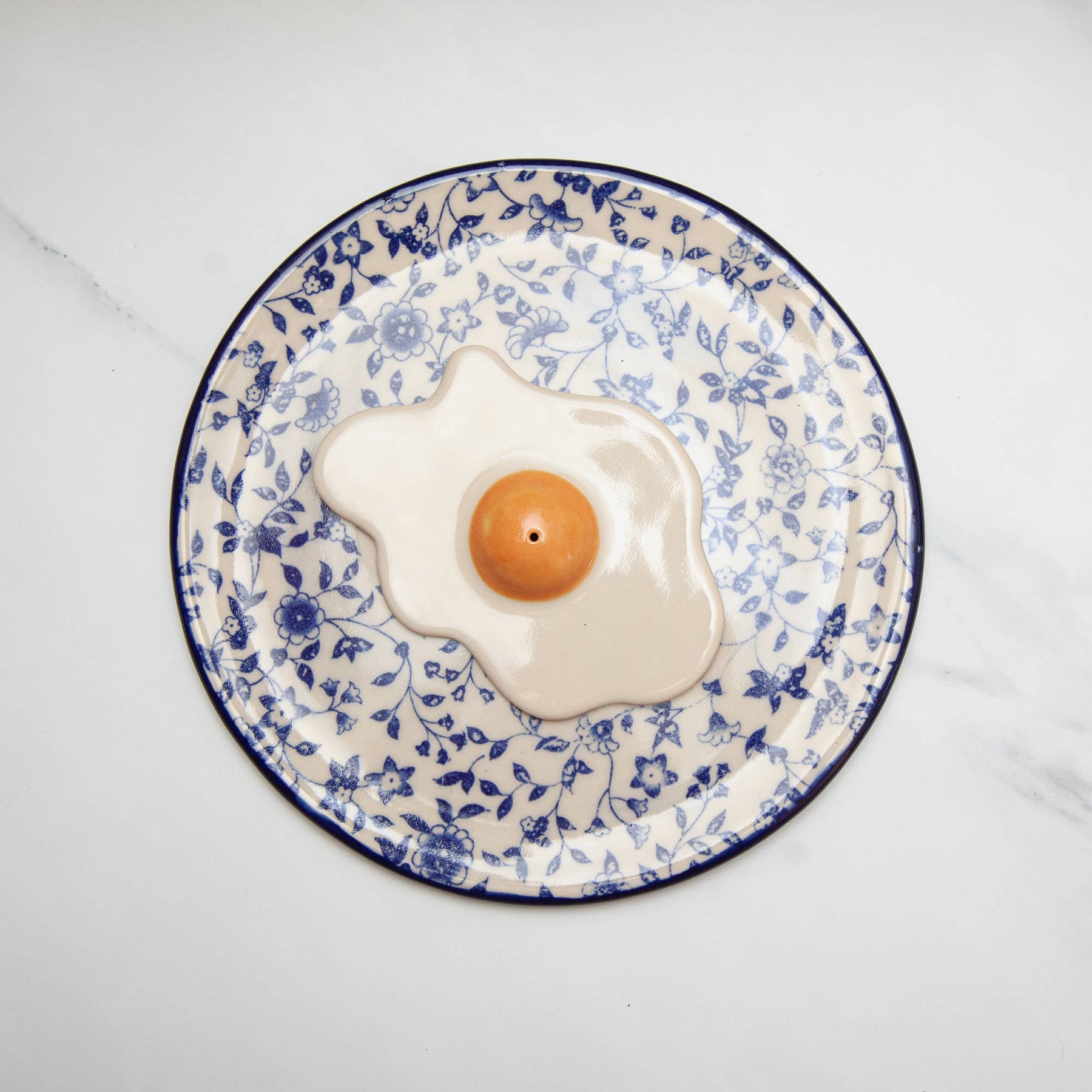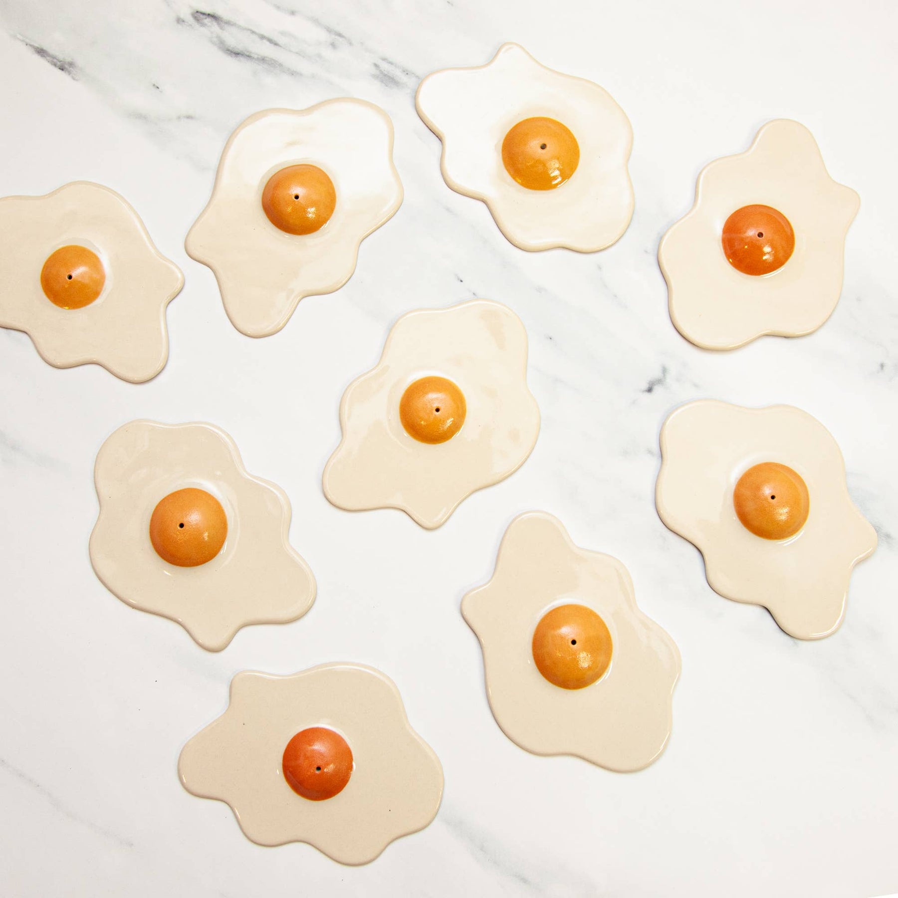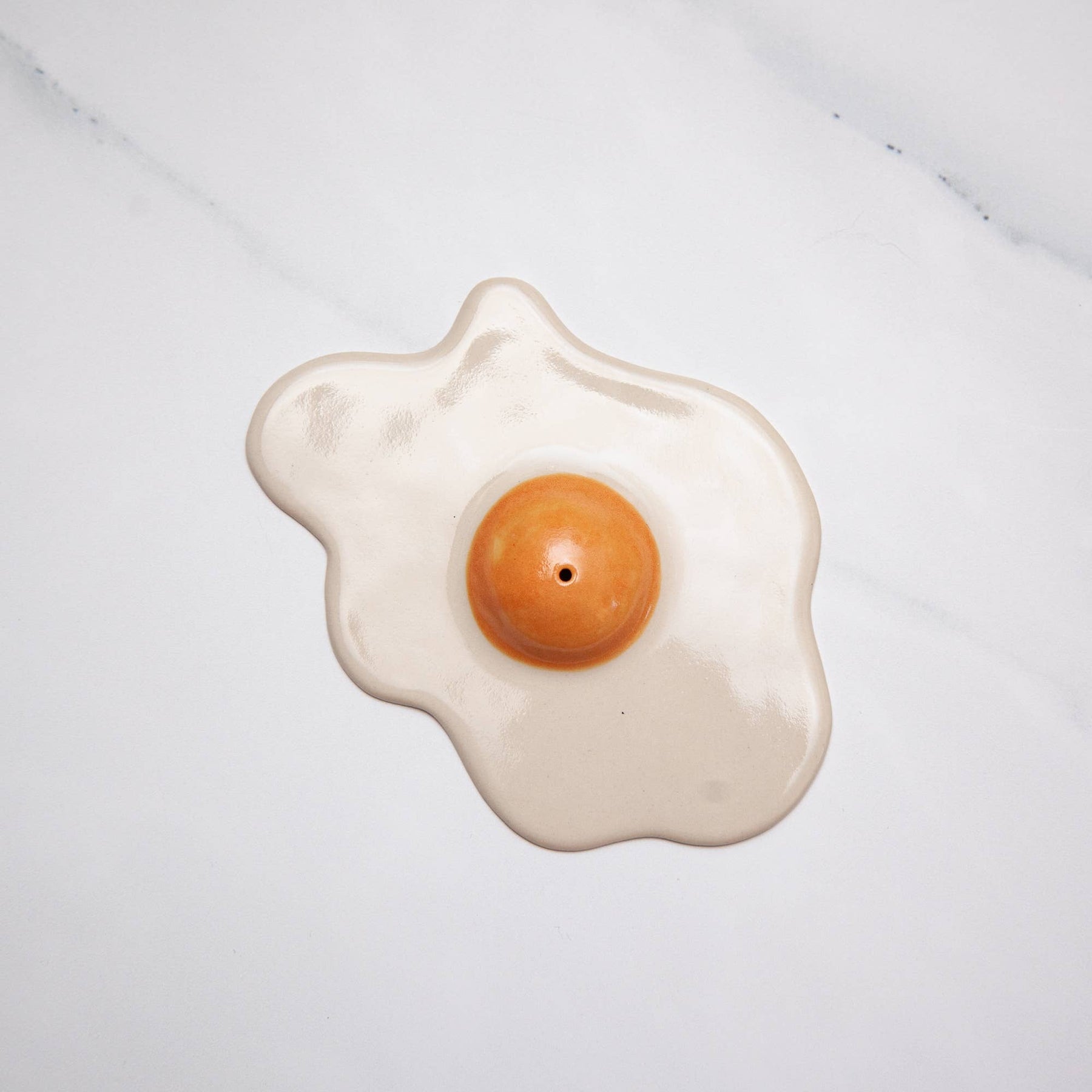 Sunny and whimsical, these fried egg incense holders feature a glossy white “egg white” base with a bright orange raised yolk, complete with a center hole to hold stick incense.