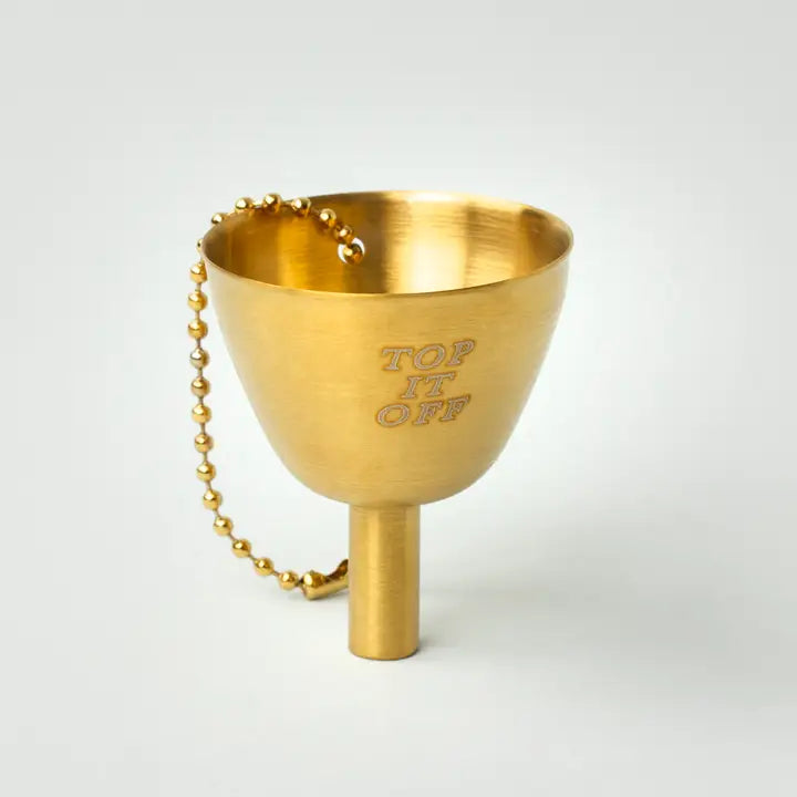 This golden flask funnel makes topping off your favorite spirits effortless and mess-free. Crafted from coated stainless steel and etched with the phrase “TOP IT OFF,” it brings a flash of humor and luxury to your bar setup. The attached chain keeps it close by whether you're mid-adventure or mixing up drinks at home.