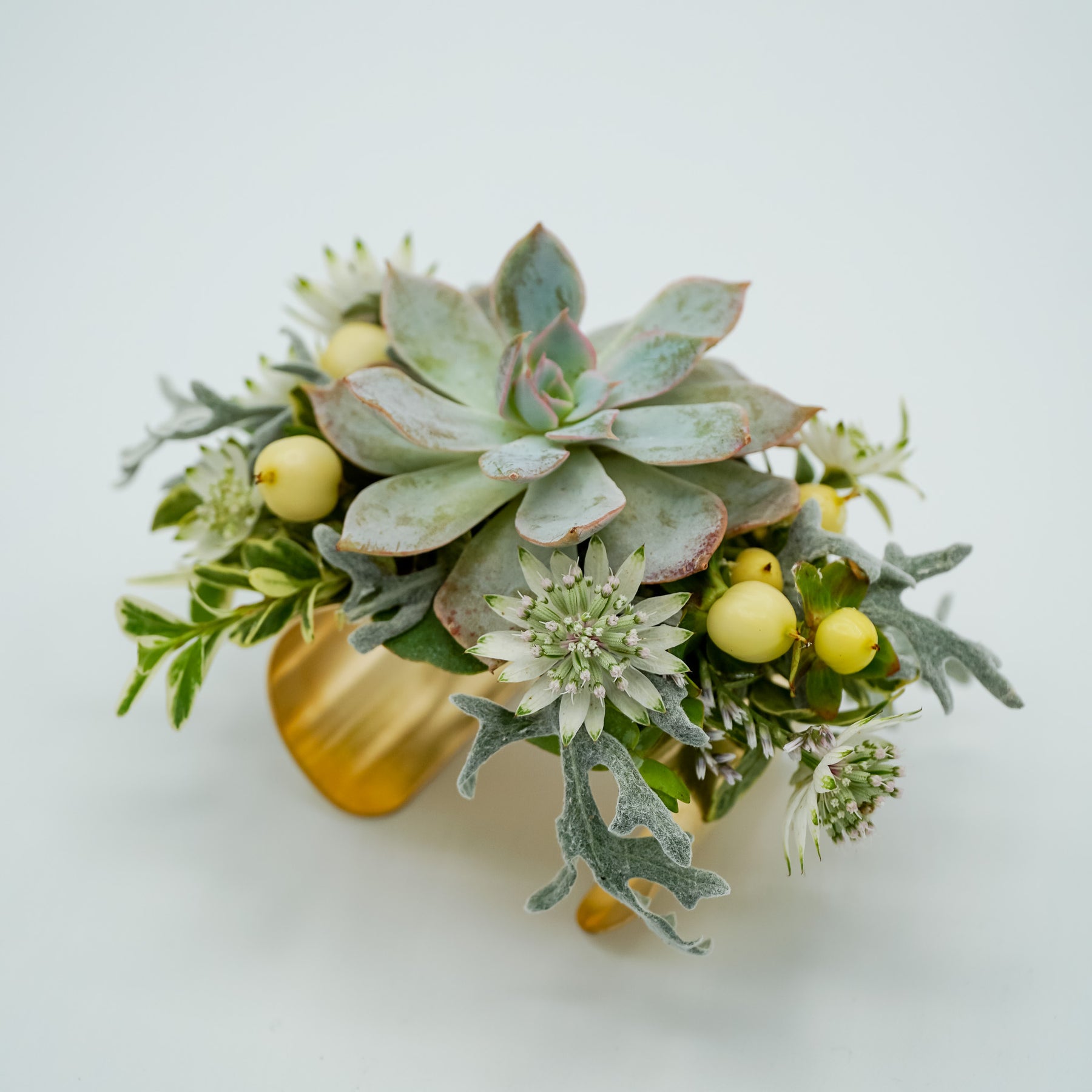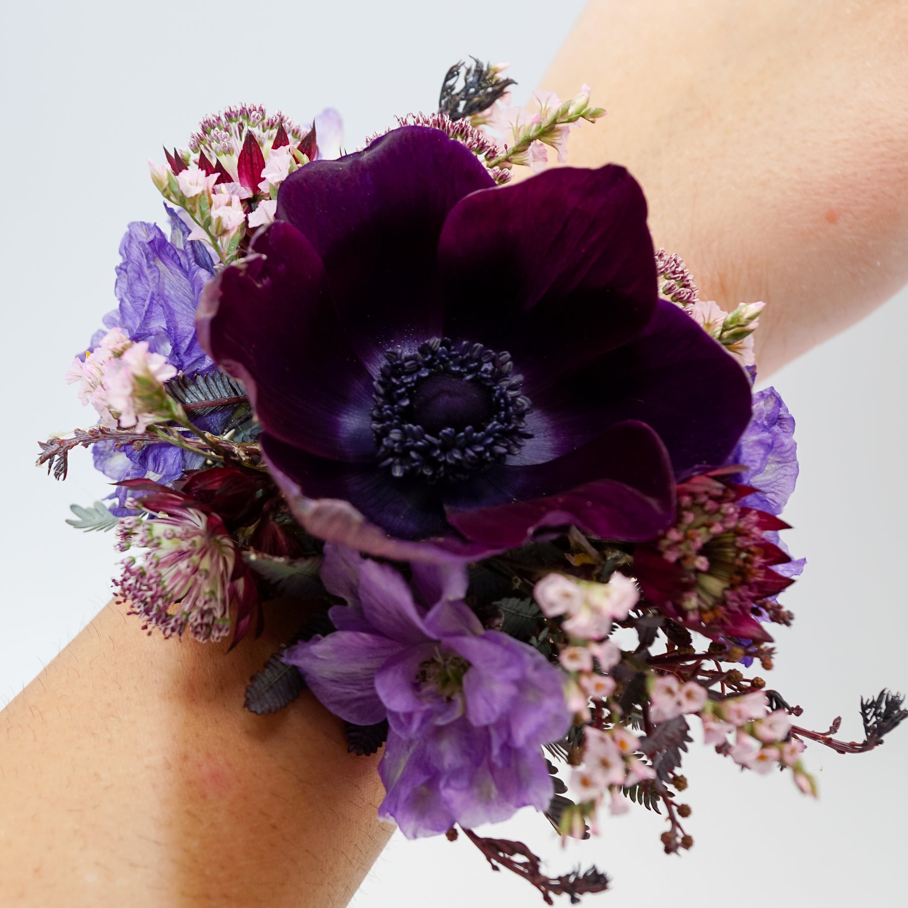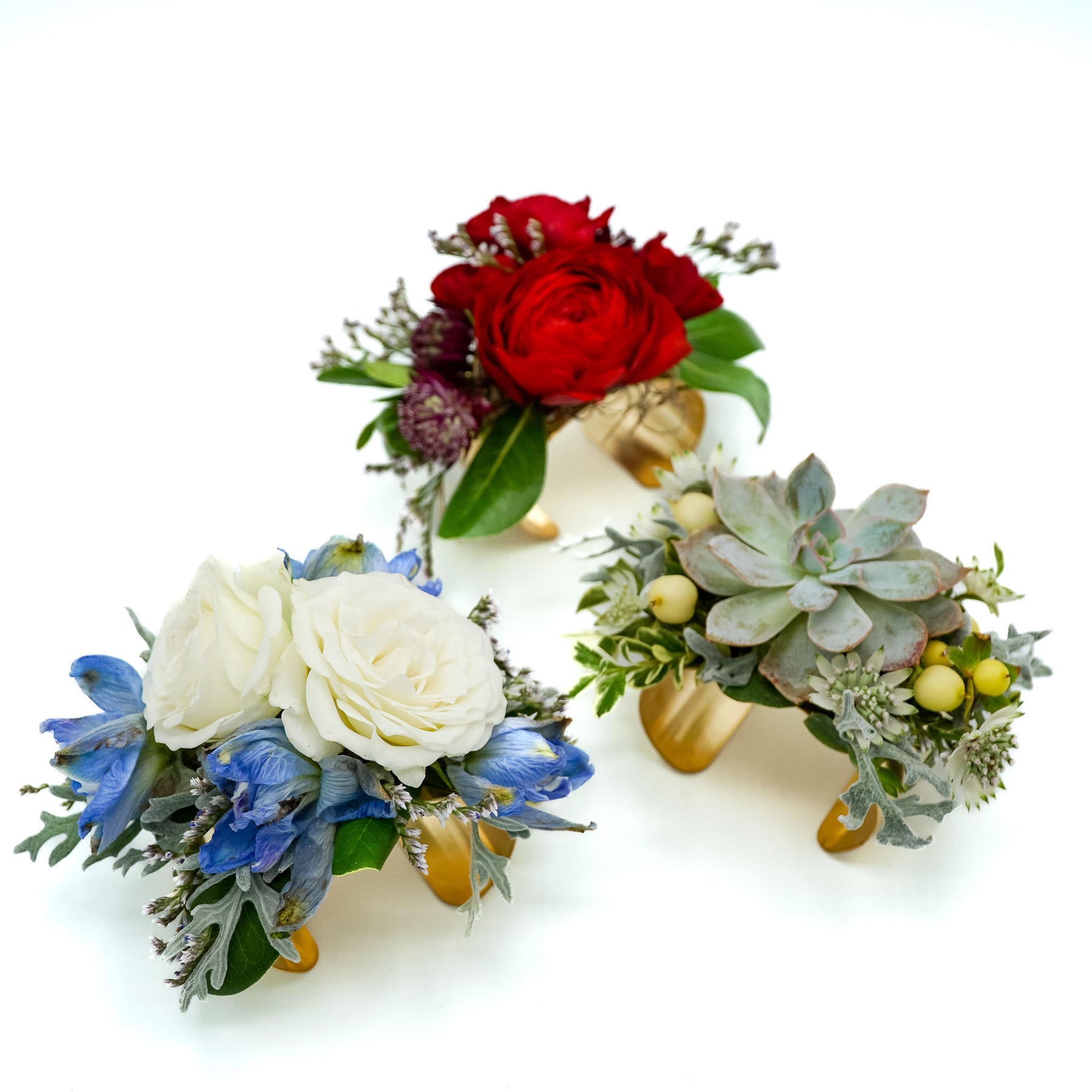 Our signature wrist corsage is created on the base of an adjustable metal cuff and adorned with an assortment of seasonal blooms and botanical accents. We recommend picking up or scheduling delivery for these cuffs the day they will be worn (refrigeration will further extend their lifetime).