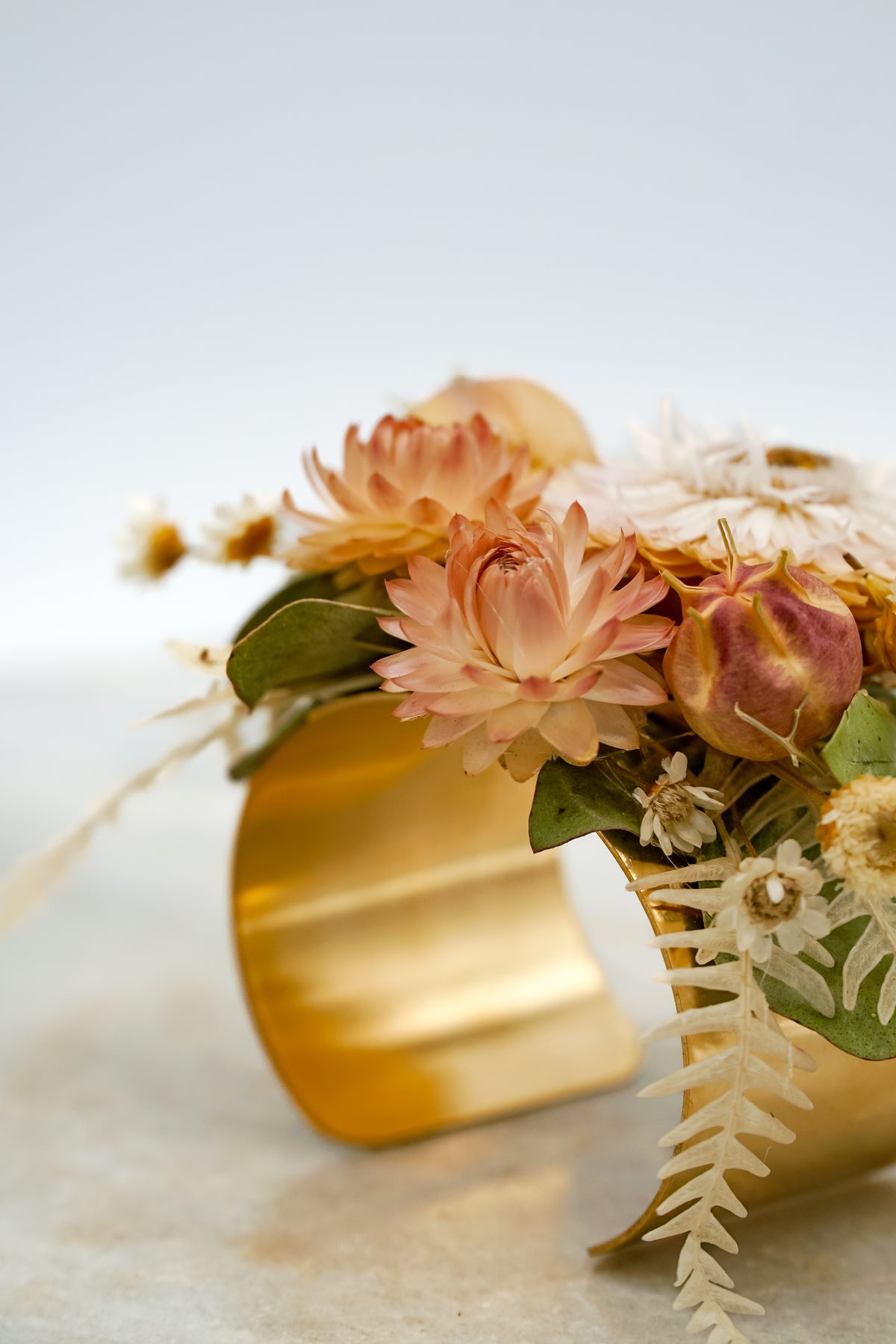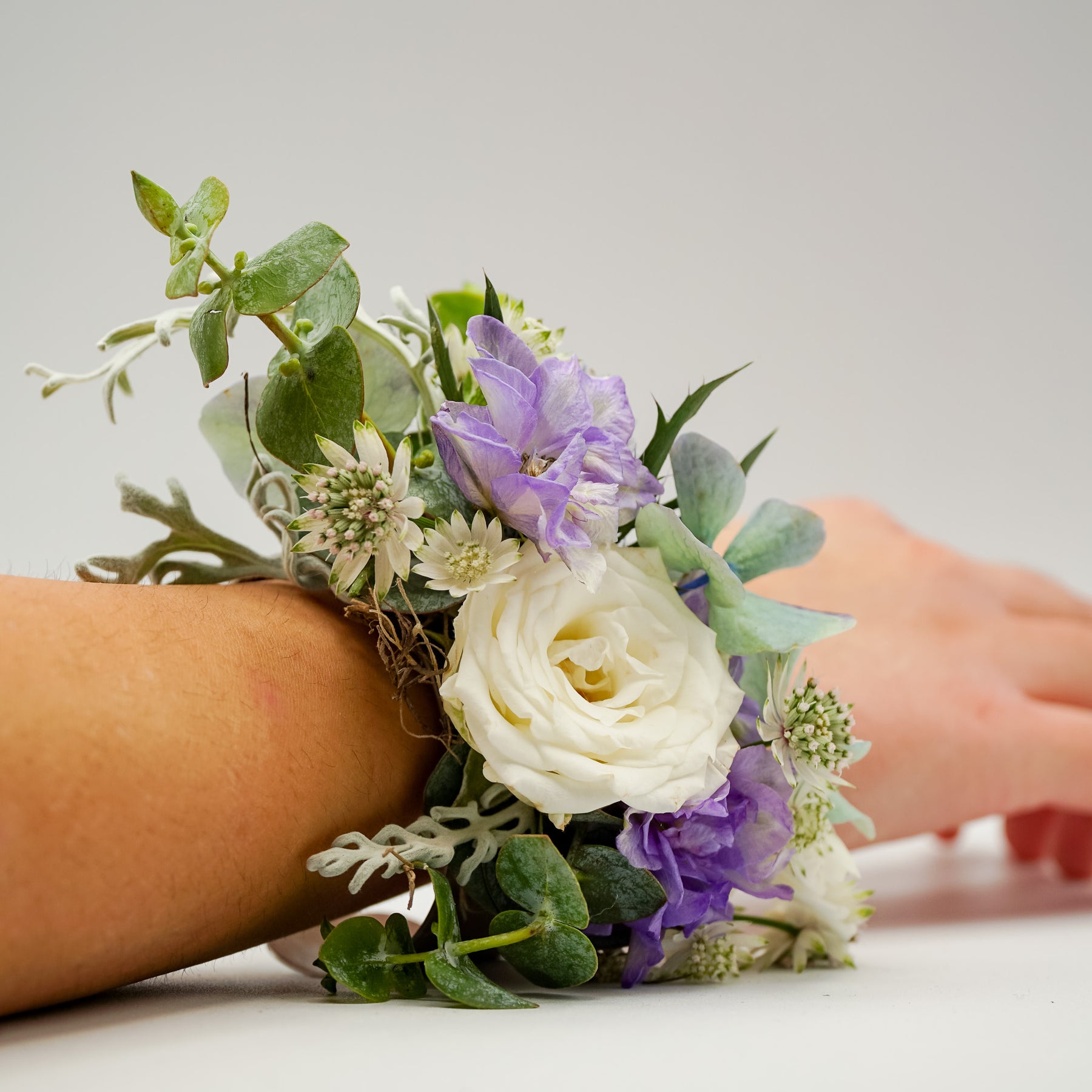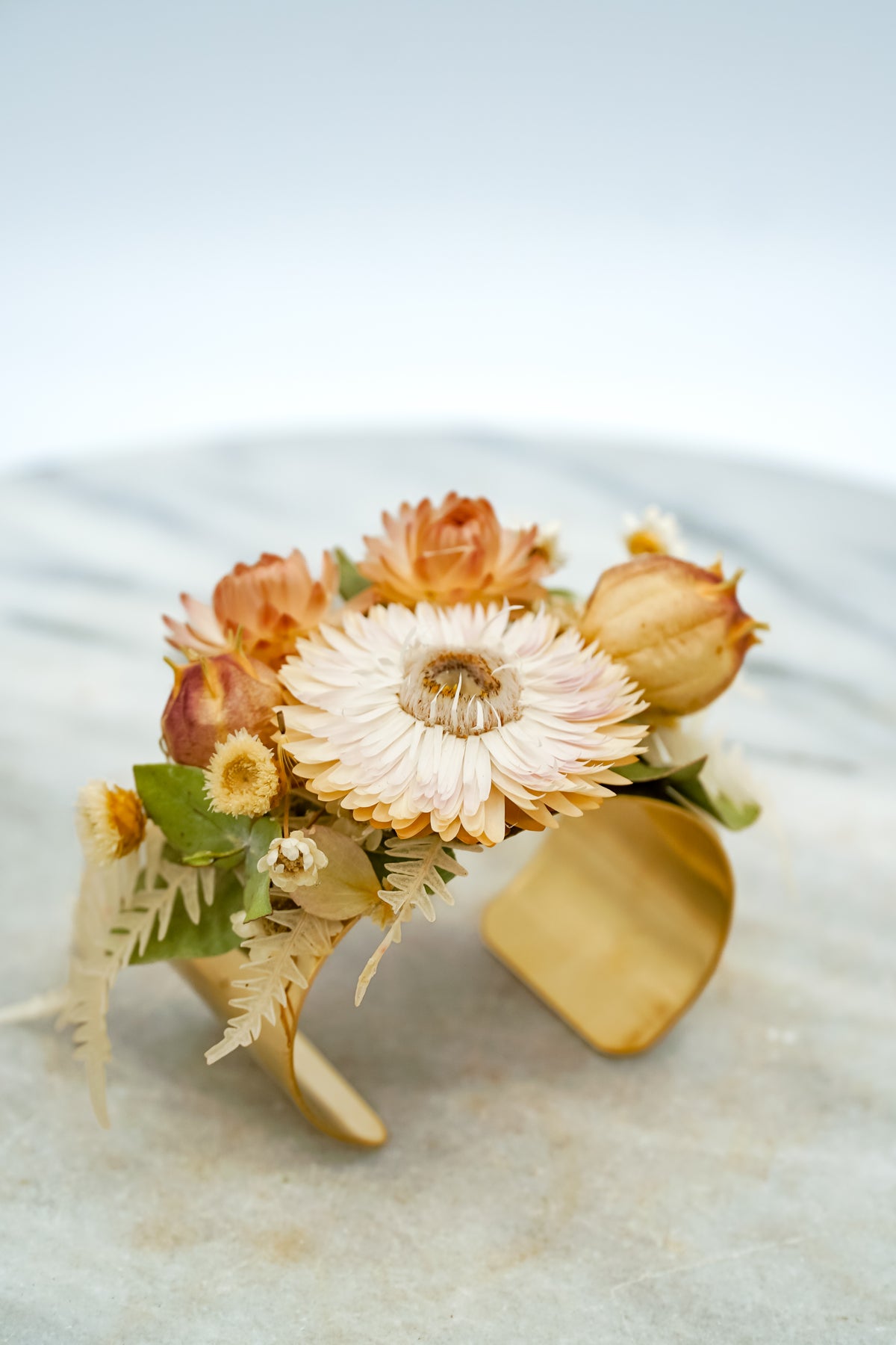 Our signature wrist corsage is created on the base of an adjustable metal cuff and adorned with an assortment of seasonal blooms and botanical accents. We recommend picking up or scheduling delivery for these cuffs the day they will be worn (refrigeration will further extend their lifetime).