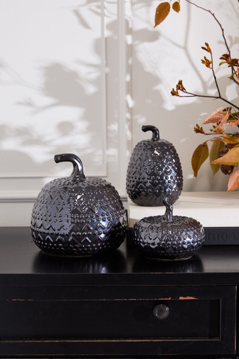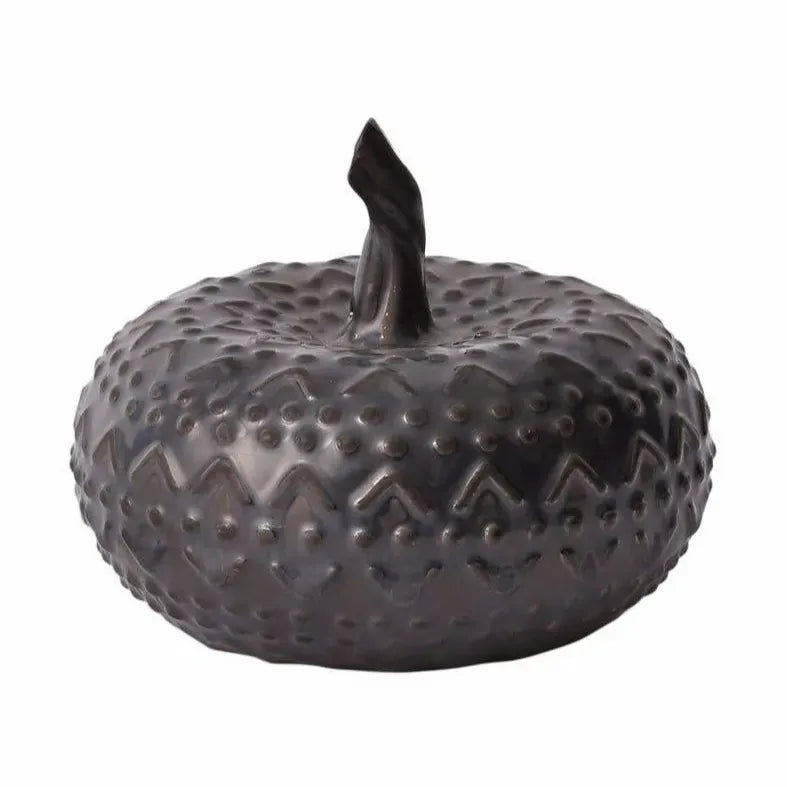 The Eerie Pumpkin figurine is a gunmetal stylized ceramic pumpkin with a metallic glaze. The surface of the Eerie has an embossed pattern that wraps around the whole figurine. Layer in with real pumpkins for a modern take on Halloween decor.