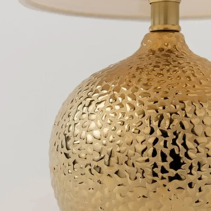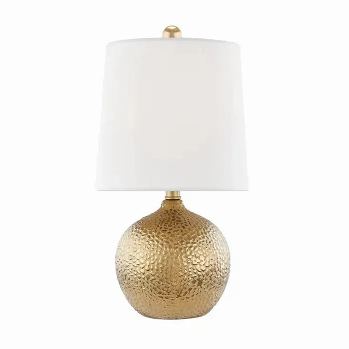 This table lamp offers a chic, textural look featuring a rounded body finished in Gold with a hammered inspired pattern, topped with a tall slightly tapered Belgian Linen drum shade. On / Off turn knob switch at socket. UL listed. Dimensions: 8"W x 14.5"T