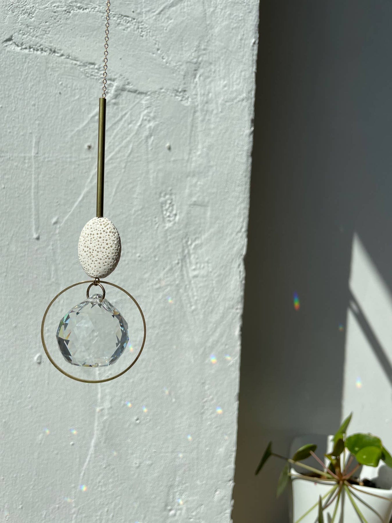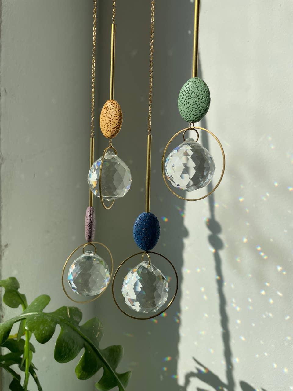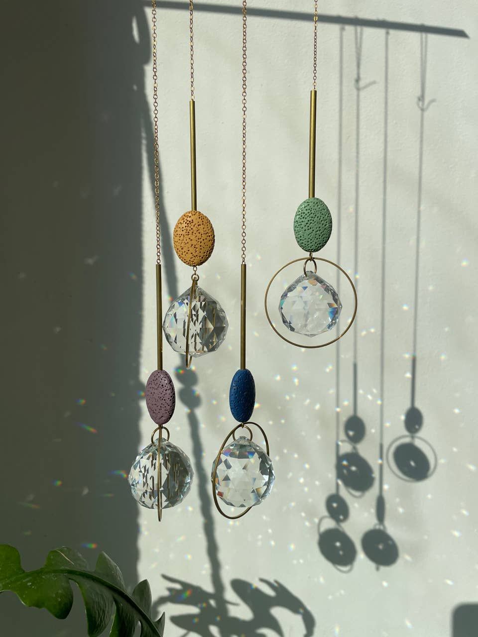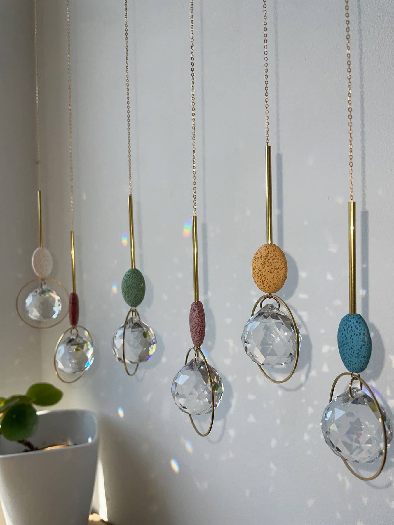 Crafted in a Hamburg studio, these handmade suncatchers scatter soft rainbow dots across your space as sunlight passes through each crystal. A lava pearl and gold-toned brass rod add texture and warmth even on overcast days. Each set includes two crystal hangers on a 50 cm brass chain, with a hook that allows flexible hanging or looping.