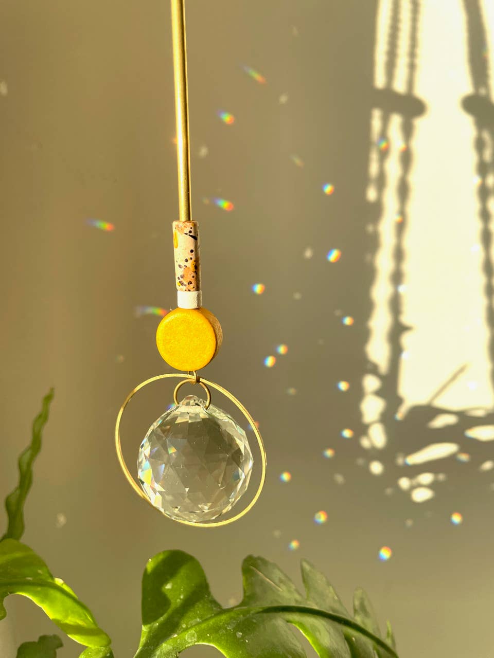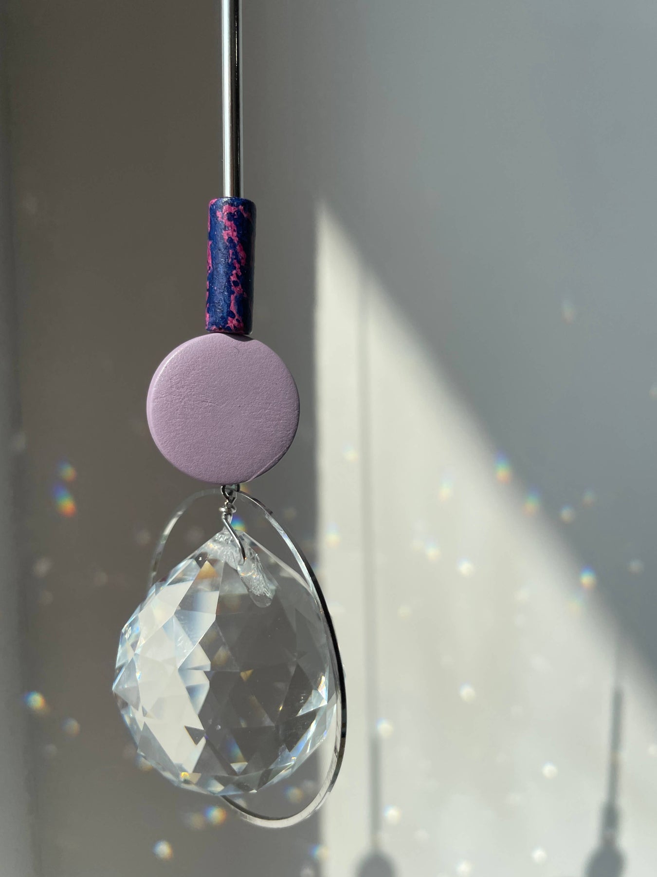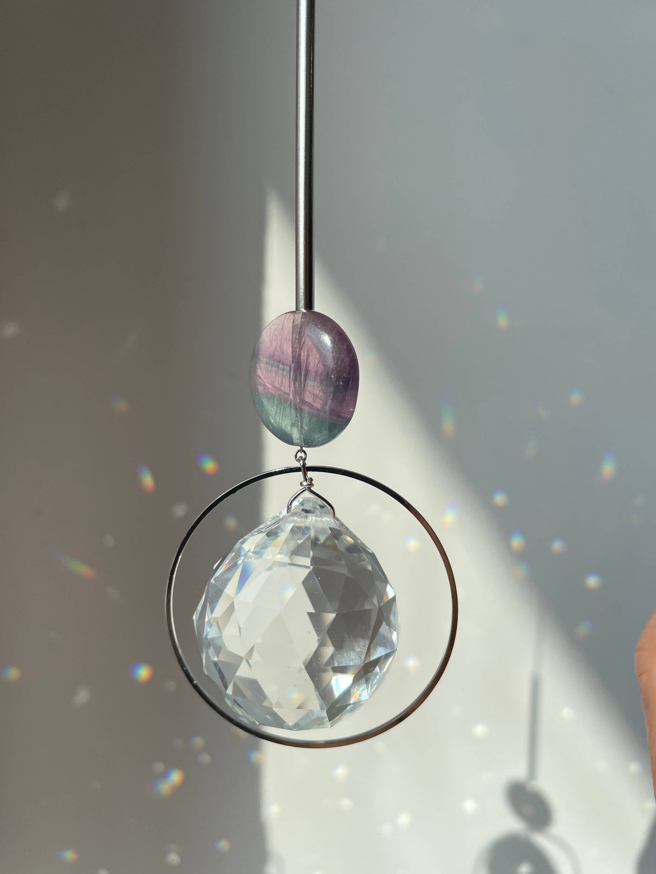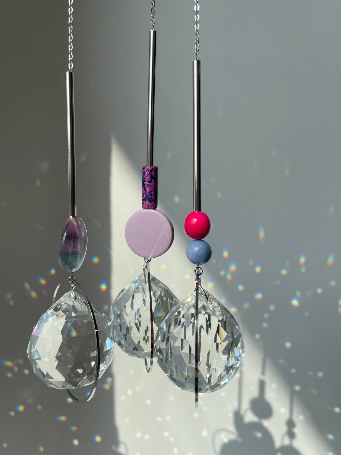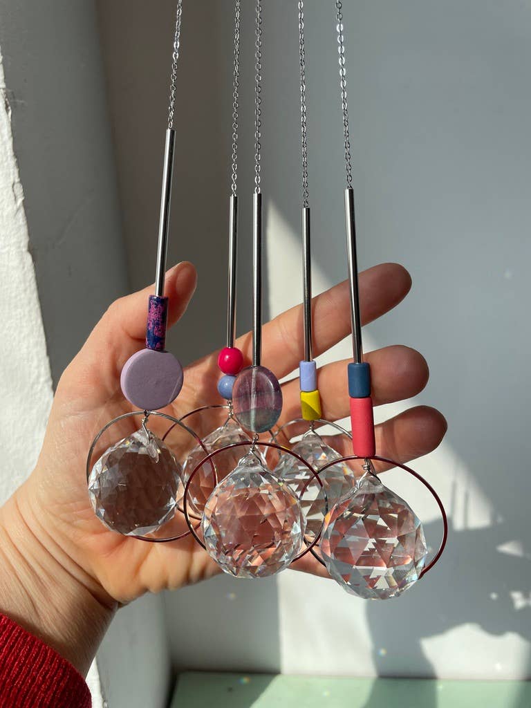 Each limited-edition suncatcher is handcrafted with a delicate chain, silver-toned tube, and a unique mix of ceramic beads and stones. Designed to catch the sun and scatter rainbow specks across your space, these hang beautifully even when the light fades. Each pair is a quiet celebration of color, reflection, and calm.
