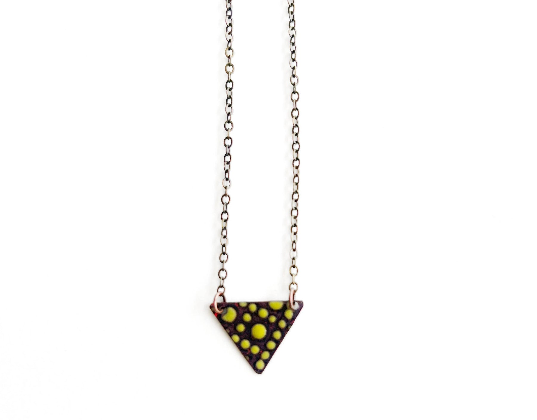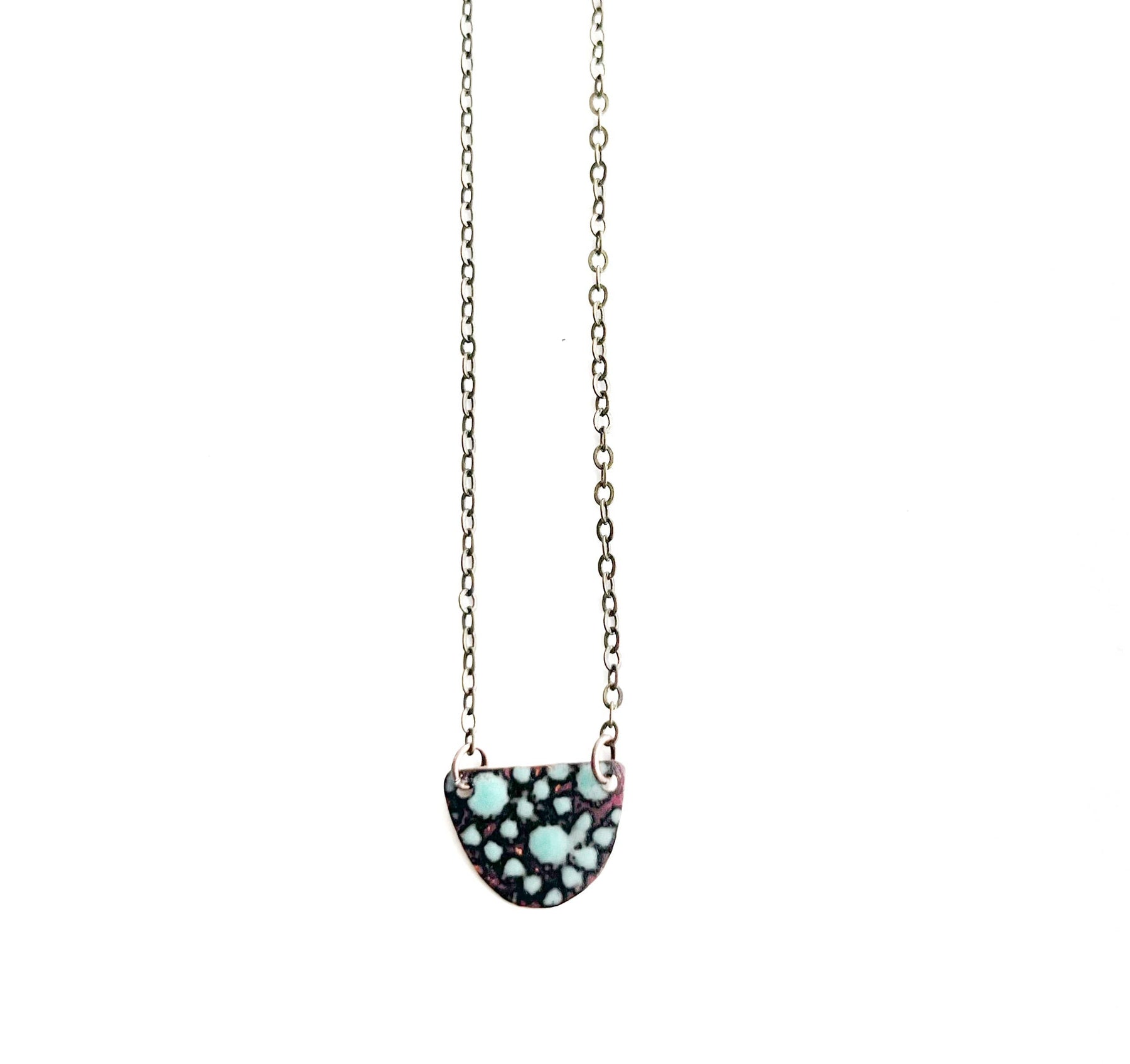 A versatile reversible necklace featuring a copper half moon pendant coated in red enamel on one side and aqua enamel on the other. The ¾-inch pendant hangs from a brass chain for effortless, everyday wear.