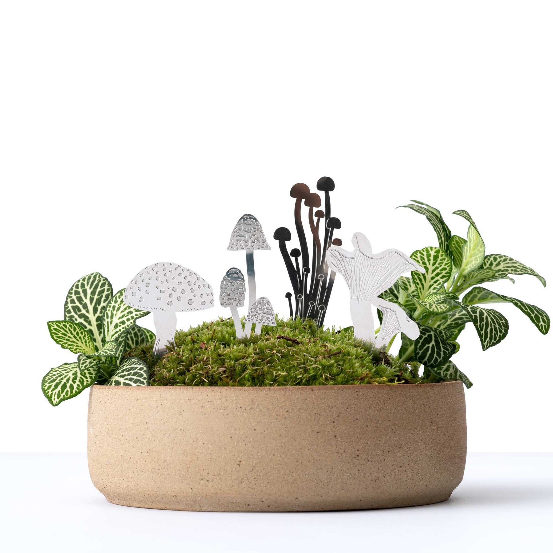 This whimsical steel mushroom set brings woodland charm to terrariums, planters, or miniature dioramas. Crafted with etched precision, each fungi form captures the quirky character of Fly Agaric, Enoki, Ink Caps, and Chanterelle. Sturdy, compact, and beautifully detailed, these mushrooms make a playful gift or fall accent.