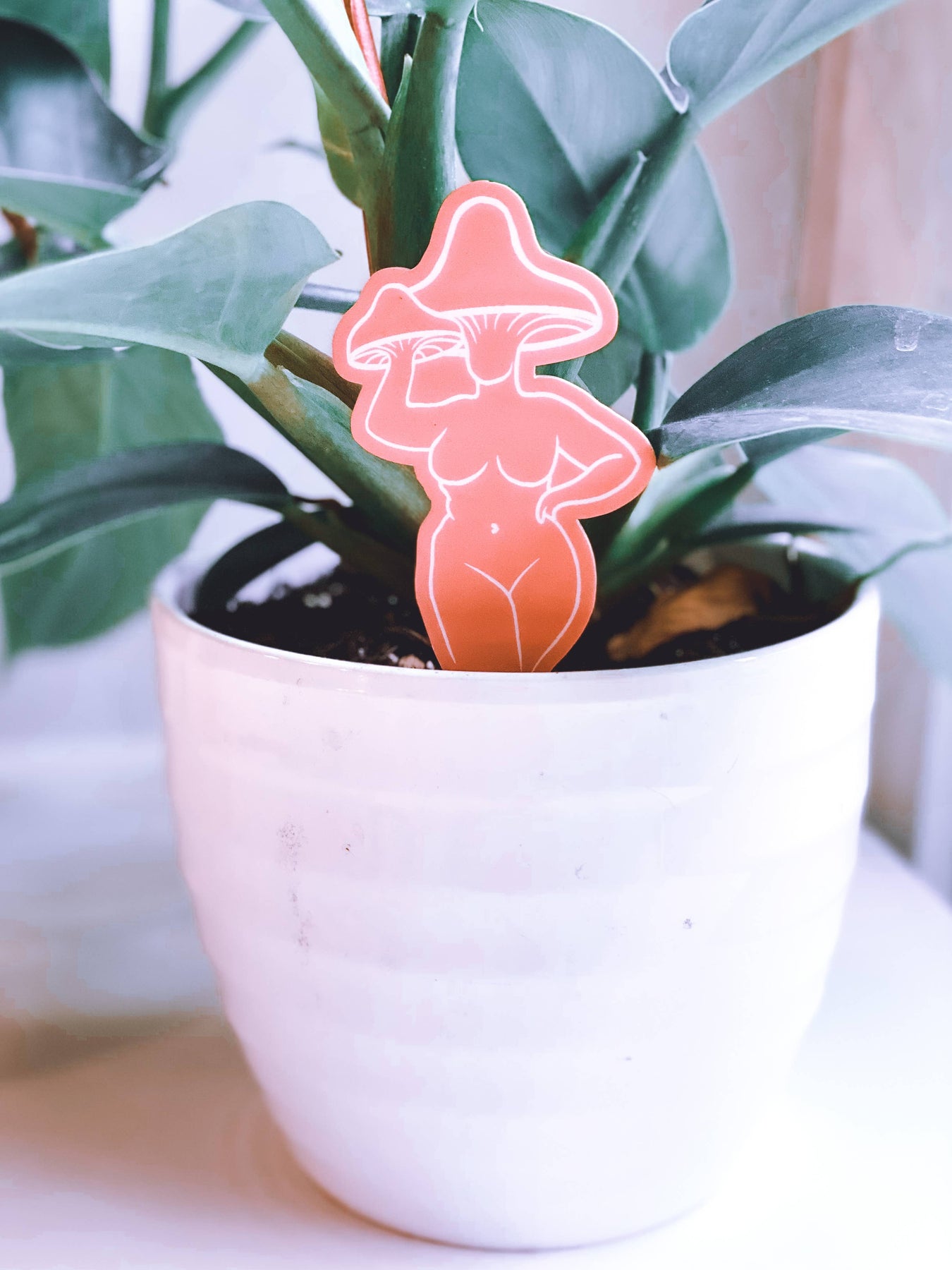 A whimsical set of terracotta-toned acrylic stakes, each etched with a graceful “mushroom lady” design that won’t fade or wear over time.