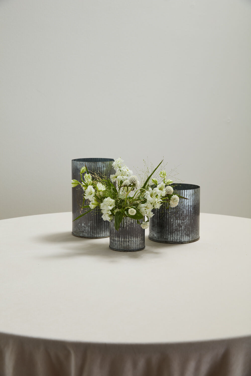 Bring rustic charm to table settings with the metal cylinder Norah Collection. Made from lightweight aluminum sheet metal with a vertical ribbed design, these versatile vessels offer a down-to-earth, chic look for everyday floral delivery or wedding & event design.