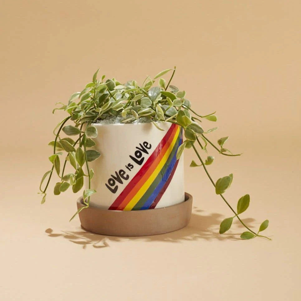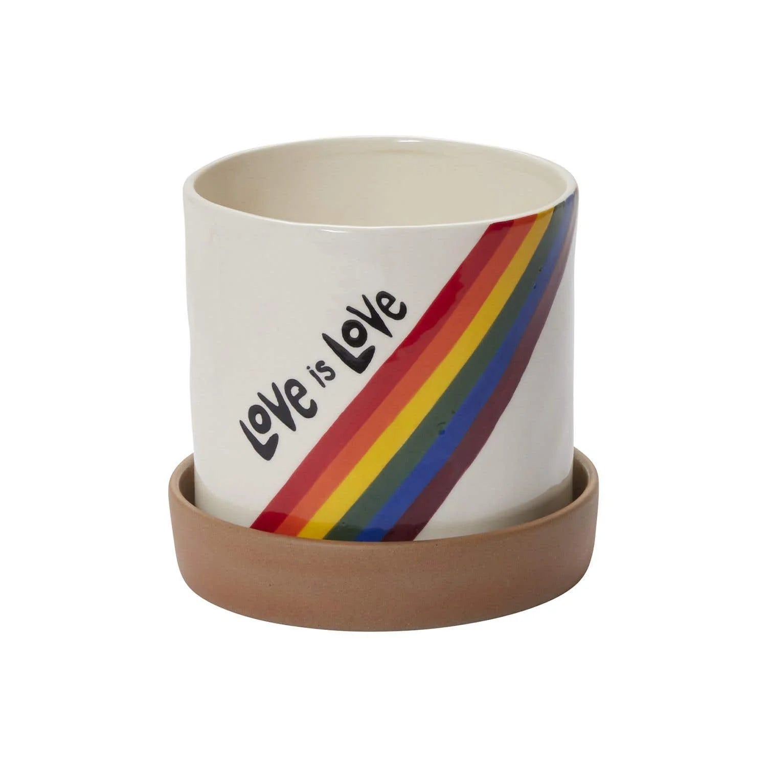 A reminder from your plant pot to the world that love is love, no matter what. This 2-piece set is made from natural brown clay. The cream-glazed pot (with drainage hole) is painted with a rainbow & empowering messaging & includes a bisque saucer.