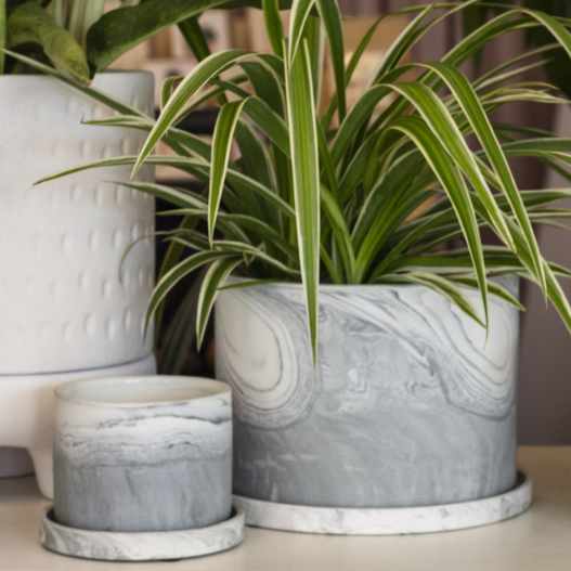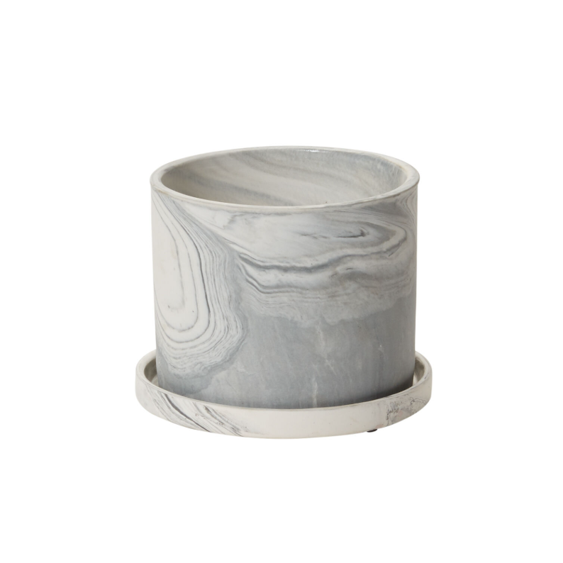 A simple silhouette and slim saucer are the ideal backdrop for a unique marbled finish of white and gray clay. Modern vibes make the Marengo Pot a stylish addition for your home and an elegant pot for every plant.