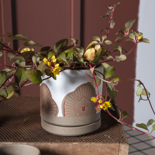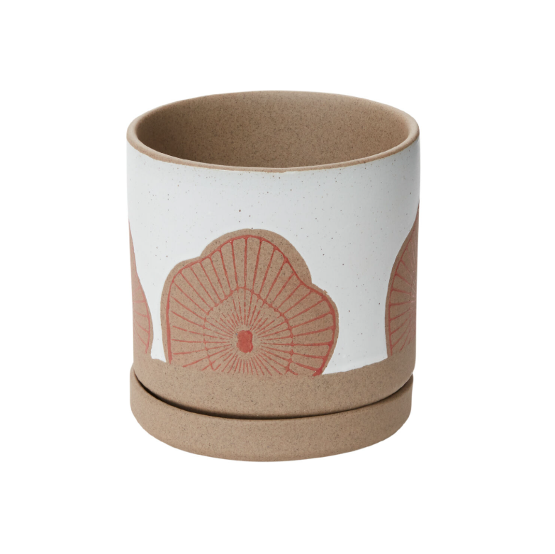 The Protea Pot is a modern and abstract way to bring nature motifs into a Harvest presentation. With a sandstone base, the pot has hand-painted mushroom motifs set in a white glaze.