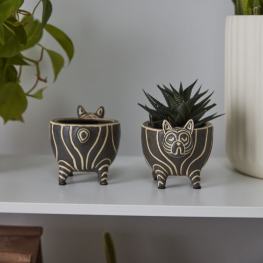 The sweetest ceramic French Bulldog there ever was, this Puppy Love Pot is a fun, non-snoring alternative to a snuggly French Bulldog. This quirky critter pot features a black glaze on a white base with etched linework. Charming details include short little legs, tiny ears, & a delightful nub of a tail. The perfect gift for a pet parent & plant lover, this playful, watertight pot accommodates a small, 3-inch drop-in plant.