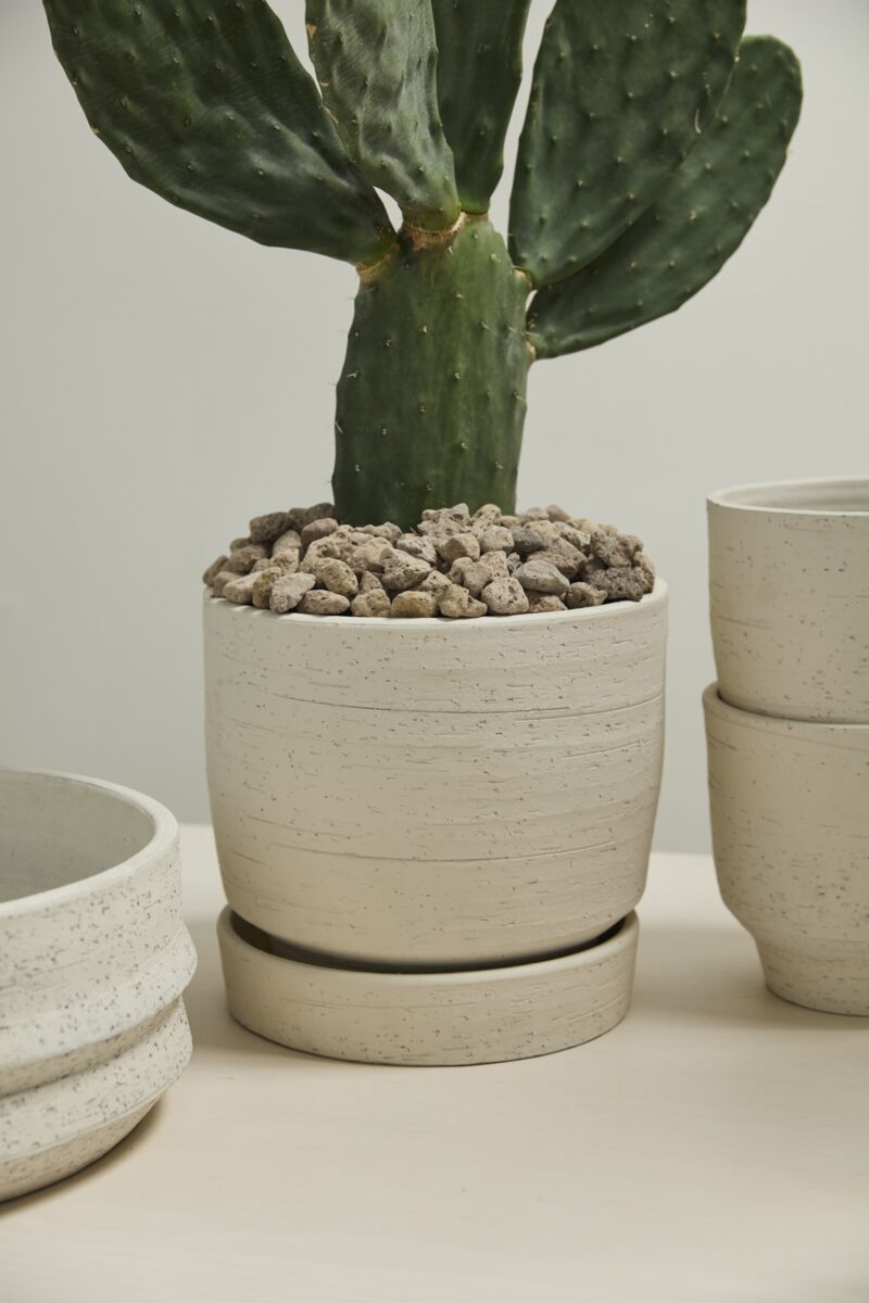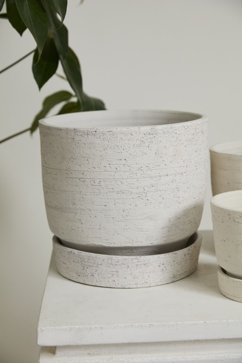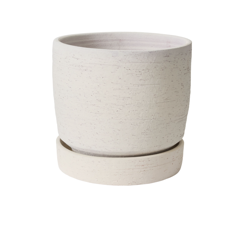 Embrace both style and sustainability with the Salvage Pot with Saucer, made from recycled terracotta and hand painted. Dried, broken bits of natural terracotta that are remnants from broken pots are crushed and mixed in with smooth clay, creating a surface texture with grit and dimension. A drainage hole and roomy saucer are ideal for an 8-inch drop in plant to be directly potted. With a warm off-white painted finish, these sturdy, matte vessels are beautiful layered together and alongside other neutrals.