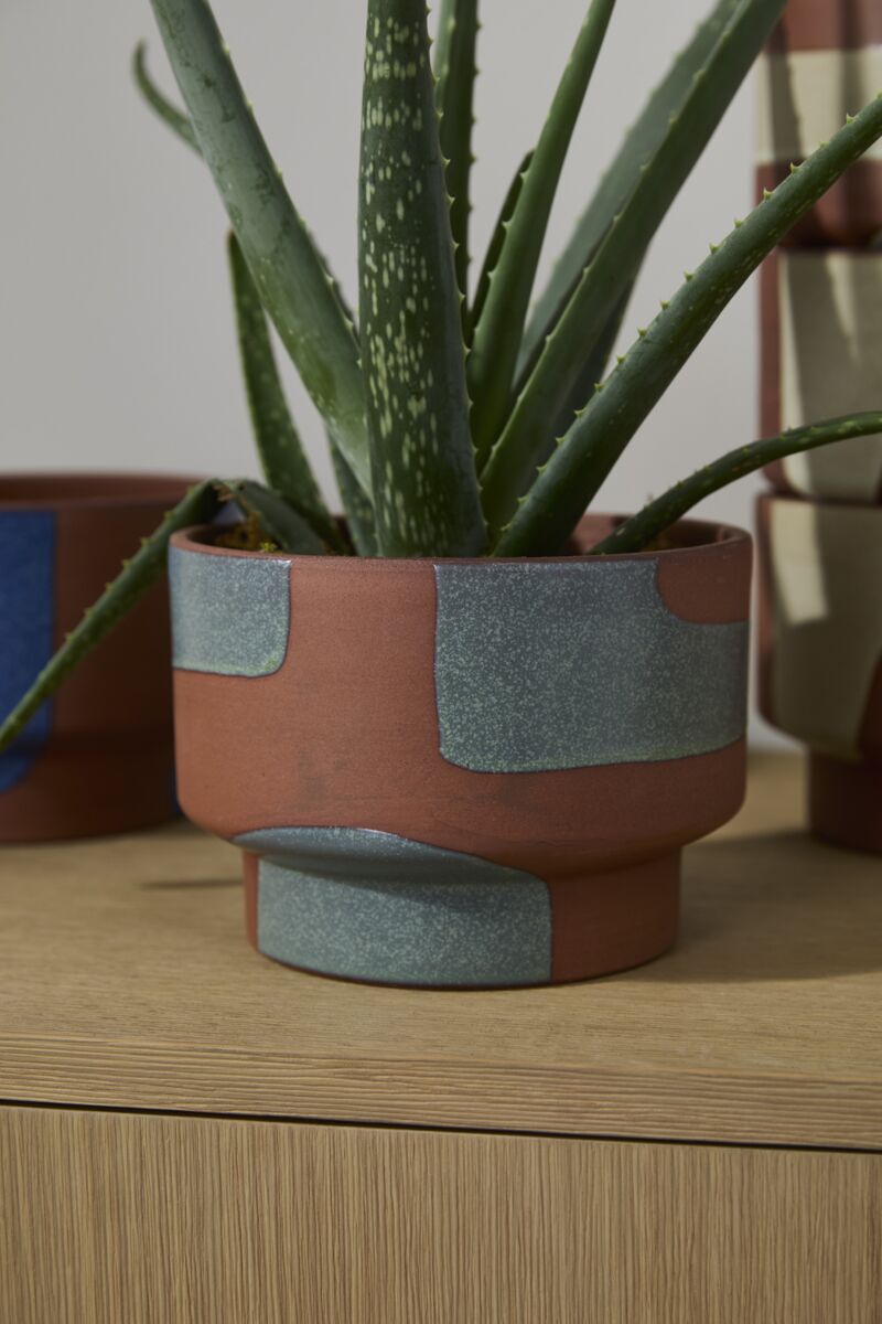 Like a modern work of art, the Shanti Pot is eye-catching with clean lines and a striking color combination.This footed pot features a hand painted colorblocked design in a sage green reactive glaze that makes any plant look vibrant and bright. It perfectly fits a 6-inch drop in pot and is stackable for easy merchandising on retail shelves. All three colorways of the Shanti Pot are grounded in a warm natural terracotta, making them a cohesive collection.