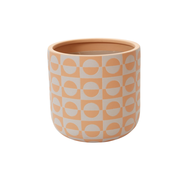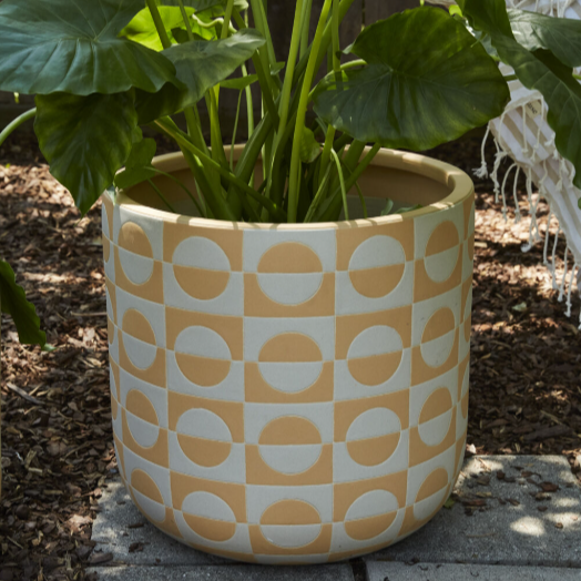 Brighten up your patio with the urban, chic look of the etched & painted large Sun Dial Pot. The tile-like, geometric, yellow-and-white textured pattern is inspired by a sunset or sunrise & adds a versatile, optimistic pop of color to any space. Made from white clay, this watertight, playful planter is perfect for temperate outdoor weather, but we recommend bringing it indoors during winter to protect the ceramic (and plants!)
