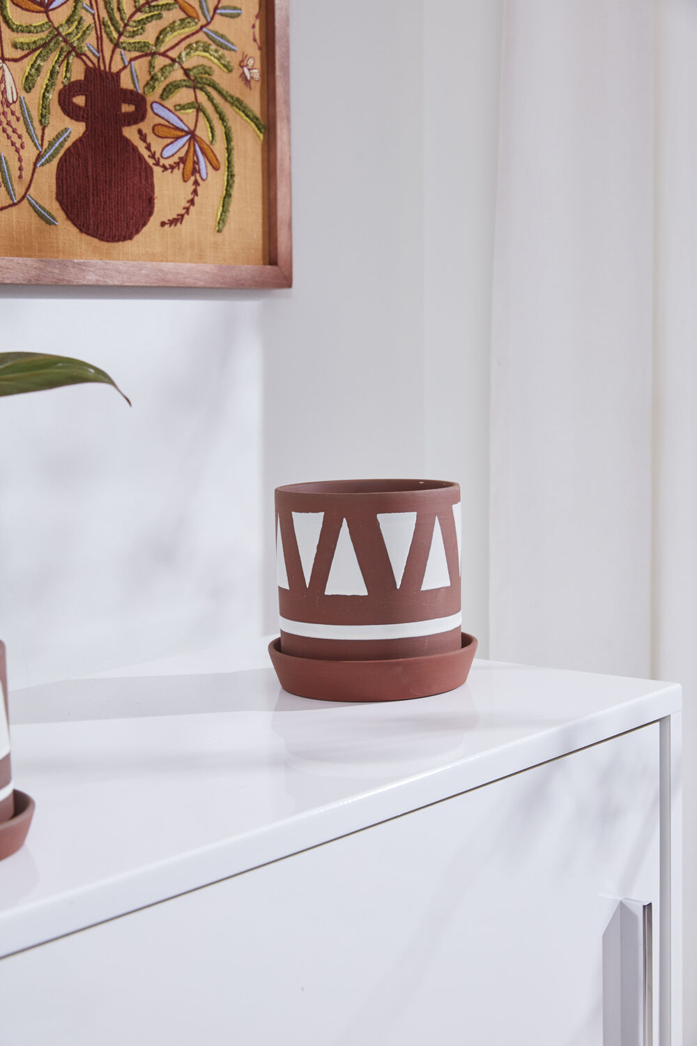 Made for displaying plants & grounding surfaces with textural dimension & artisanal design, the medium terracotta Tajin Pot brings a modern earthiness to the home. Featuring a drainage hole & saucer to collect water, this pot elevates any plant & home decor with its organic, hand-painted application of white glazed geometric triangles on the dark terracotta exterior.