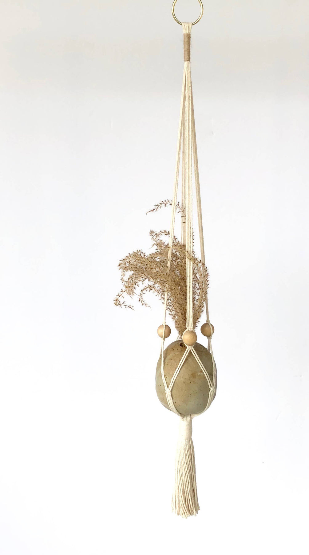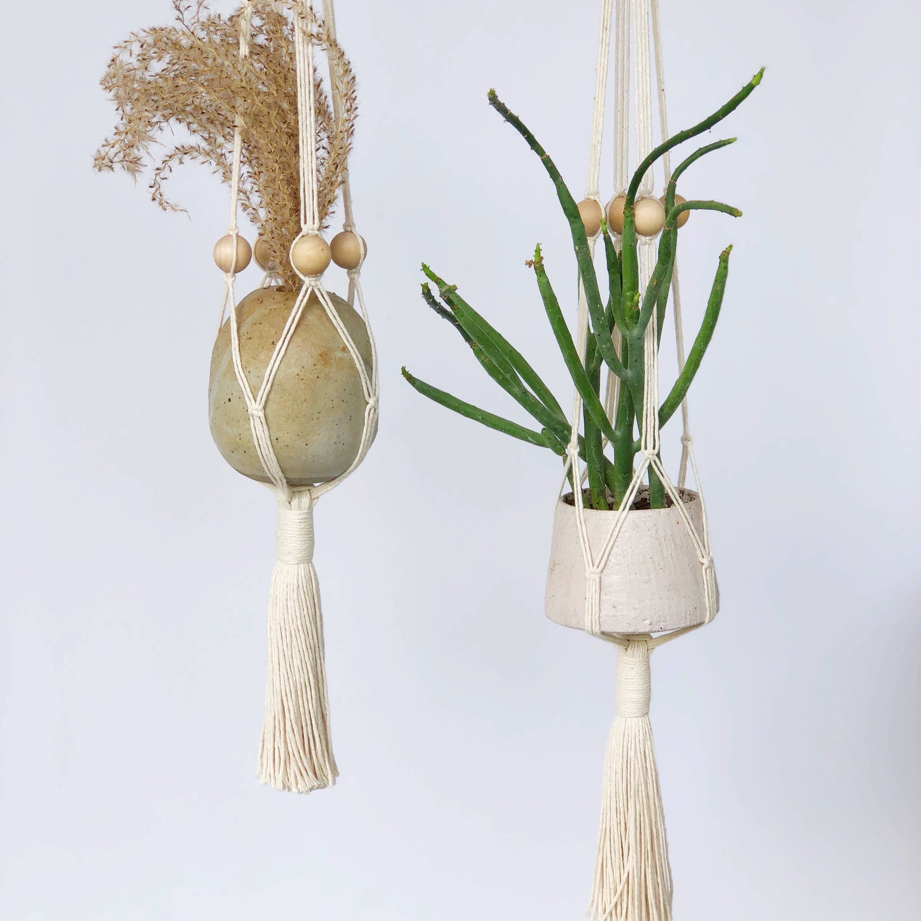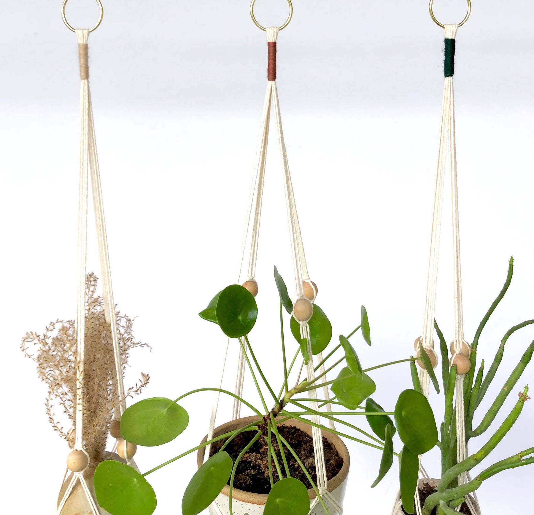 Crafted with slender natural twine and accented by small wooden beads, these airy hangers offer a gentle balance of simplicity and charm. Each piece hangs from a brass ring and features a touch of wool wrap in your choice of earthy tones—perfect for brightening up corners, windows, or narrow wall space.