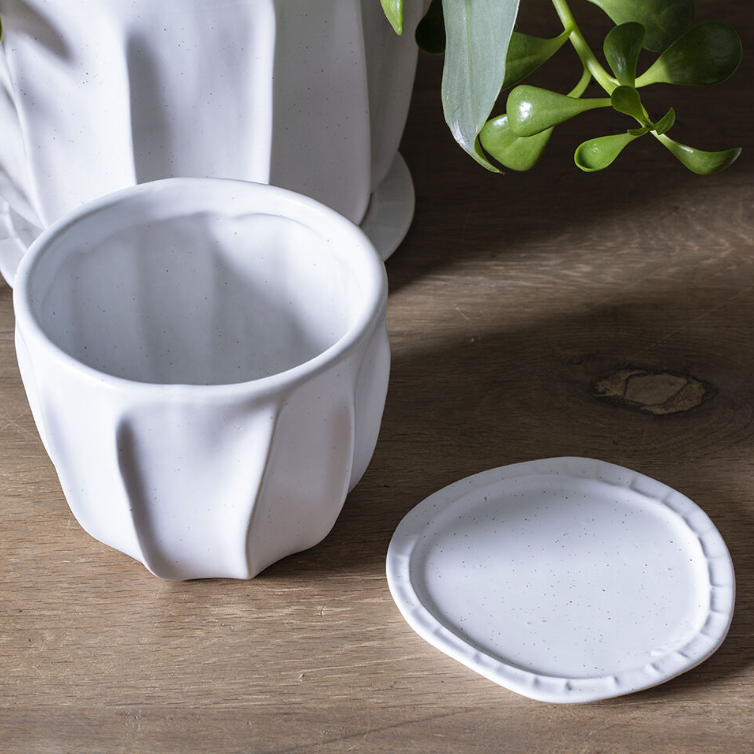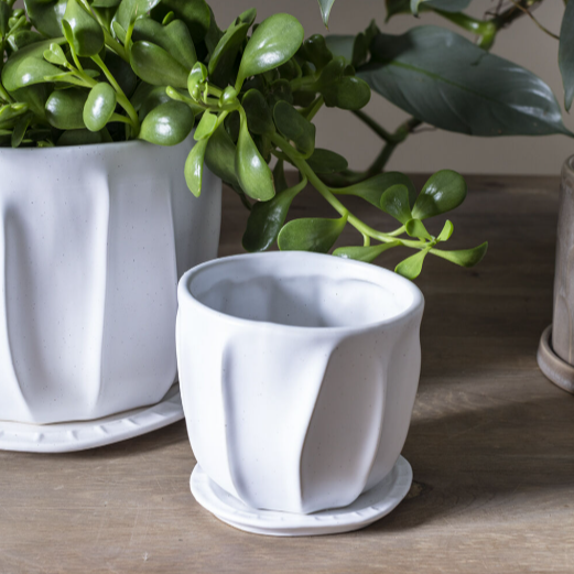The Draken Pot features a smooth white finish with raised grooves to add organic style to a simple silhouette. A drainage hole and simple saucer make it an everyday staple with an extra dose of style.