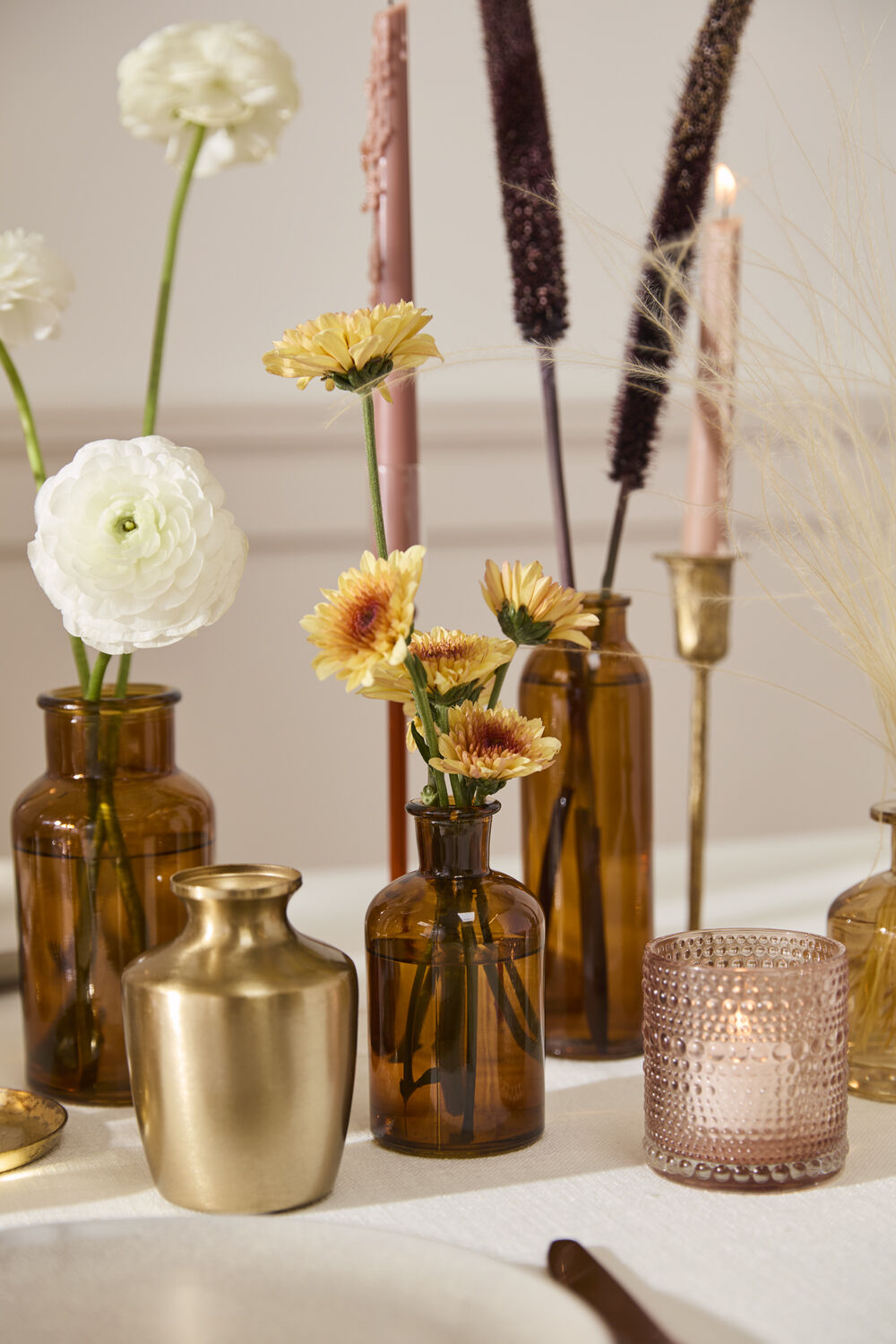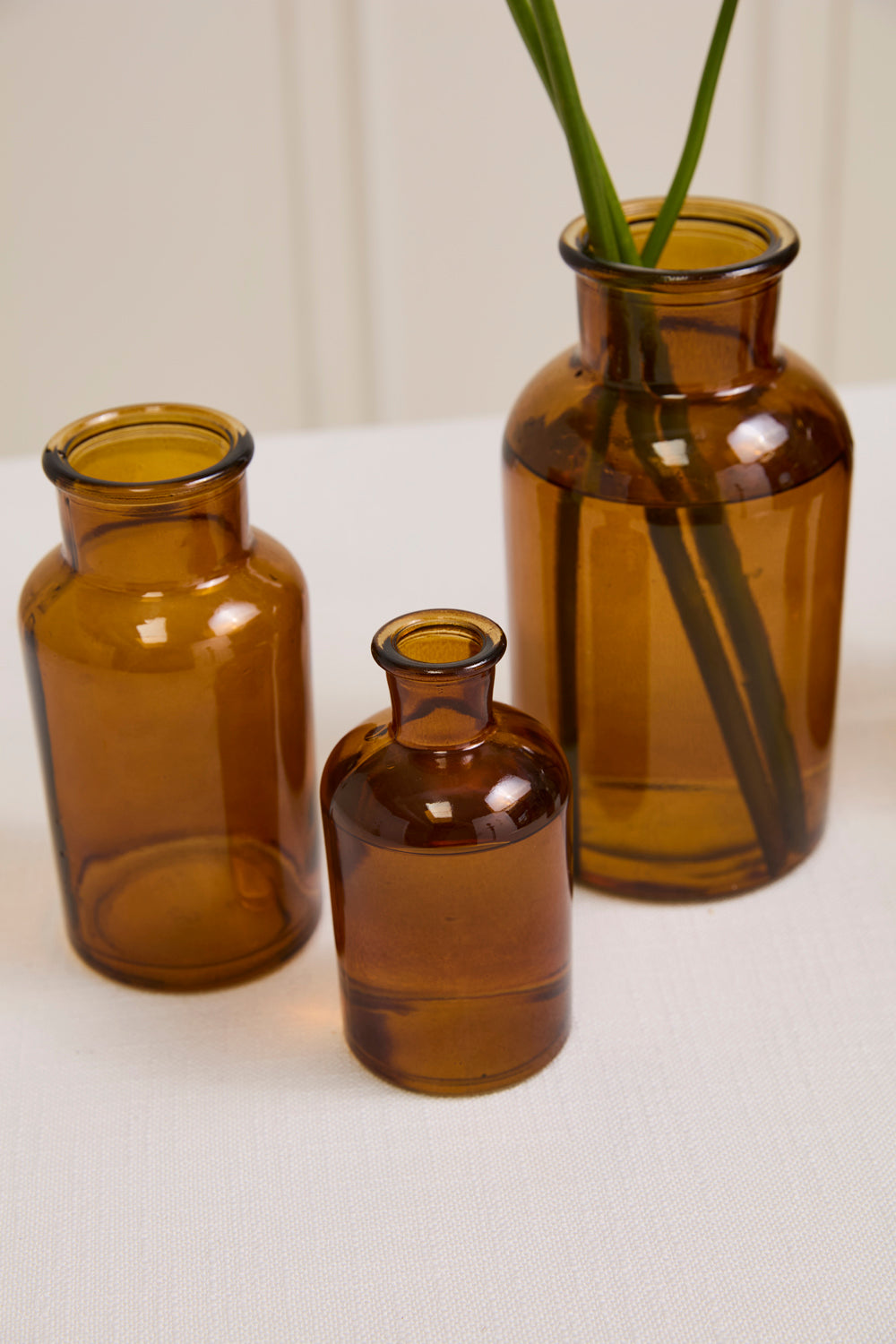 Let the flowers steal the show with the Amber Billie Bottle Collection, a family of five warm, translucent amber vases and budvases in sizes that can be grouped together for a collected, charming display. With a range of opening sizes from less than an inch to just under 3 inches, these are perfect for a bunch of fresh or dried stems. We recommend gently cleaning the surface with a damp cloth to protect the beautiful color.