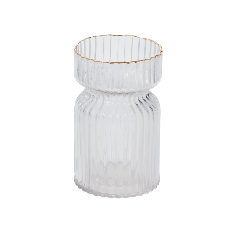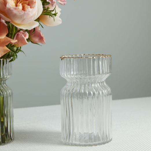 Set the table with elegance & sophistication with the small glass Odette Vase, featuring a ribbed texture, cinched neck, & an exquisite gold metallic rim. Made from lightweight, textured glass, this cylindrical vase is a modern take on classic design that effortlessly complements everyday decor or special events, filled with any style of florals.