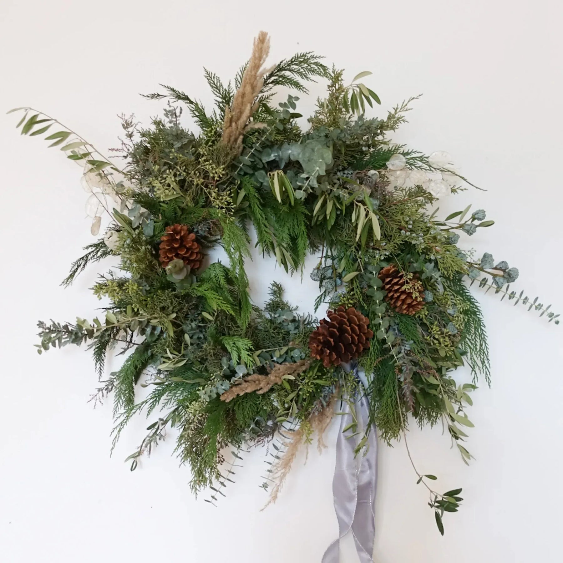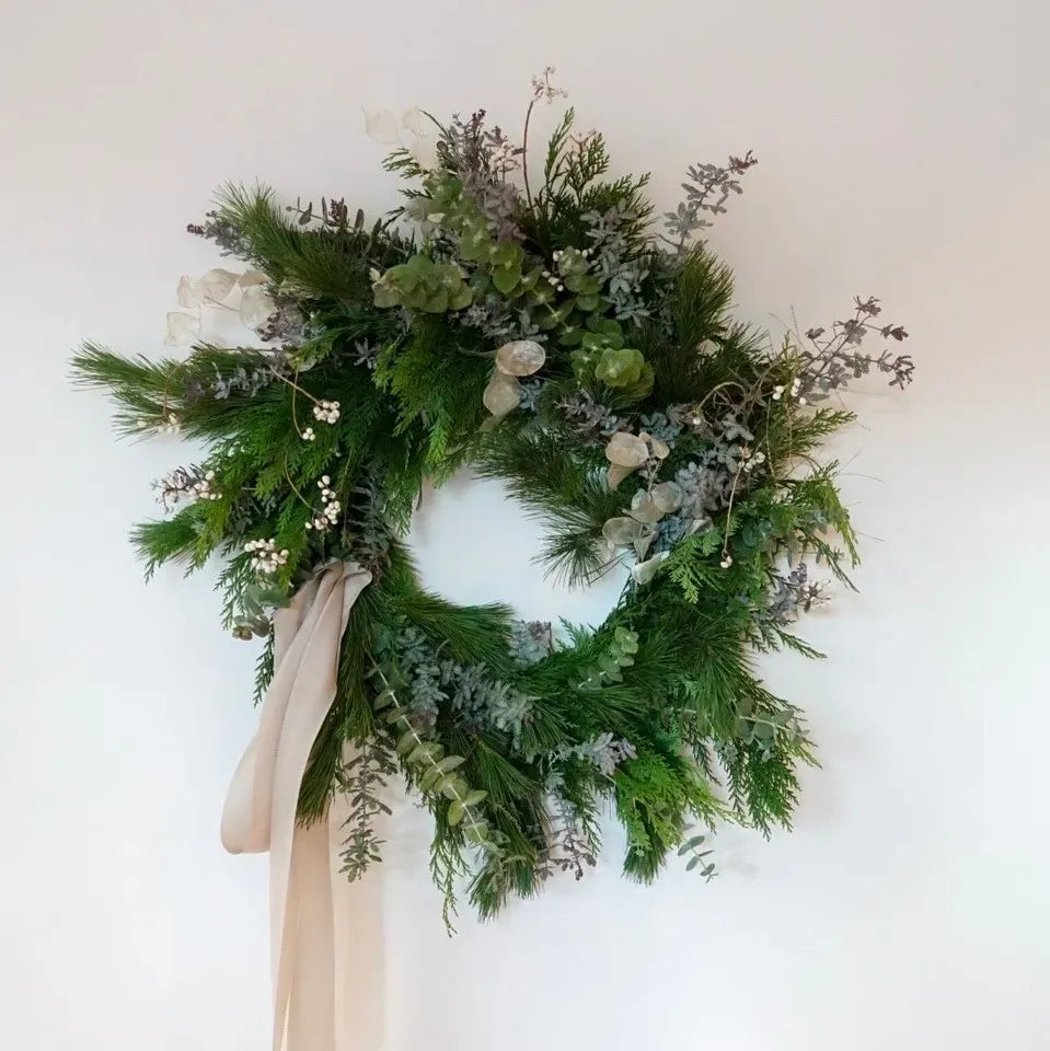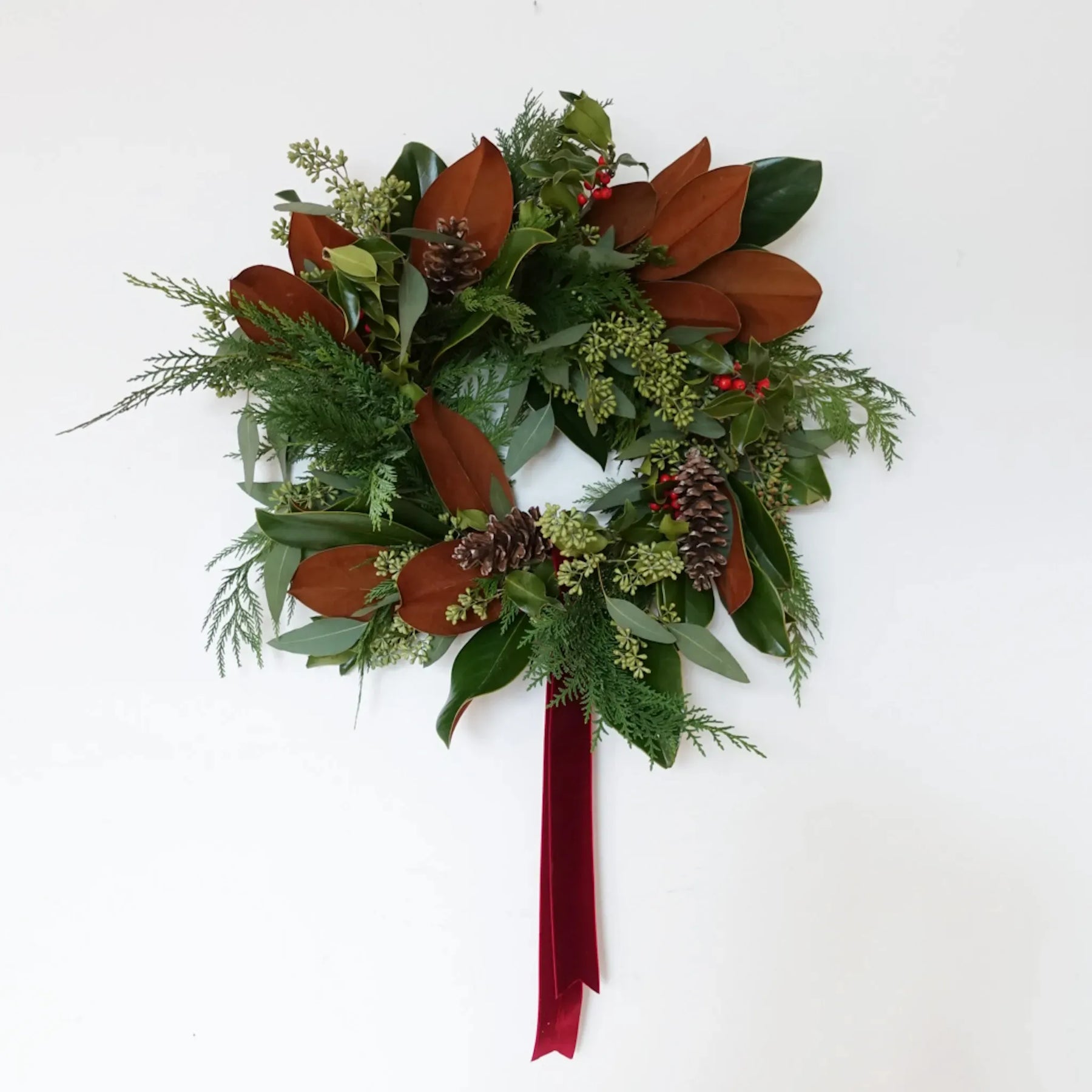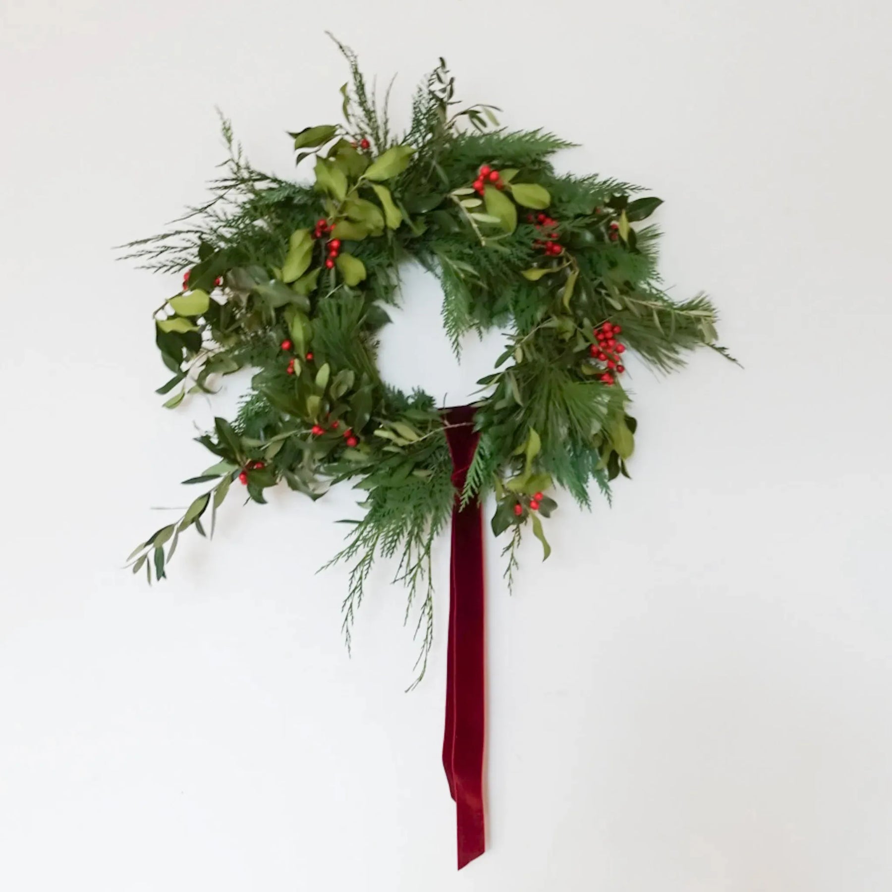 Our artisan winter wreaths incorporate a beautiful collection of our seasonal favorites: cedar, cypress, holly, juniper, pine, ilex berry, and more! These fragrantly fresh ingredients are woven together by our talented florists to create a bespoke design.