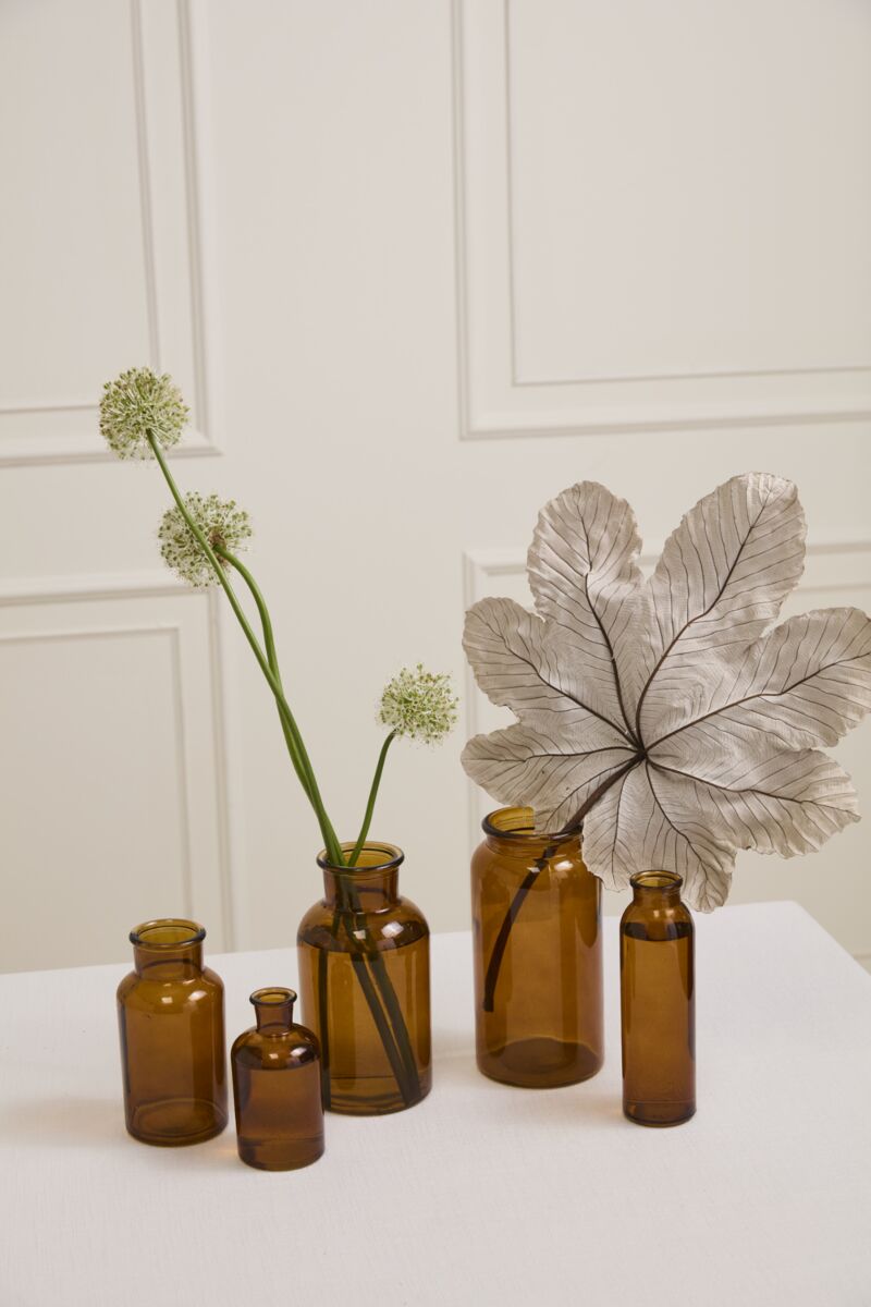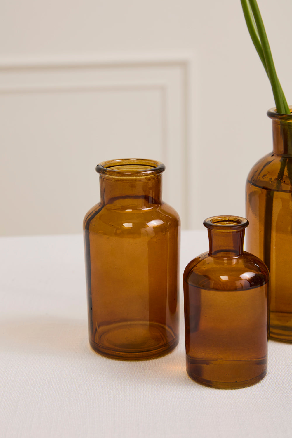 Let the flowers steal the show with the Amber Billie Bottle Collection, a family of five warm, translucent amber vases and budvases in sizes that can be grouped together for a collected, charming display. With a range of opening sizes from less than an inch to just under 3 inches, these are perfect for a bunch of fresh or dried stems. We recommend gently cleaning the surface with a damp cloth to protect the beautiful color.