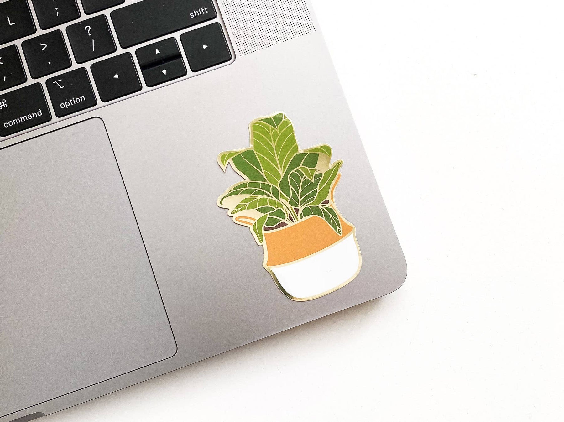 Its playful mix of broad green leaves and luxe metallic detailing makes it a standout wherever you place it. Whether you're dressing up your laptop, planner, or tumbler, this piece brings a warm, leafy accent to your everyday tools. Designed by Paper Anchor Co., it’s a bright little statement for plant lovers with a sense of style.