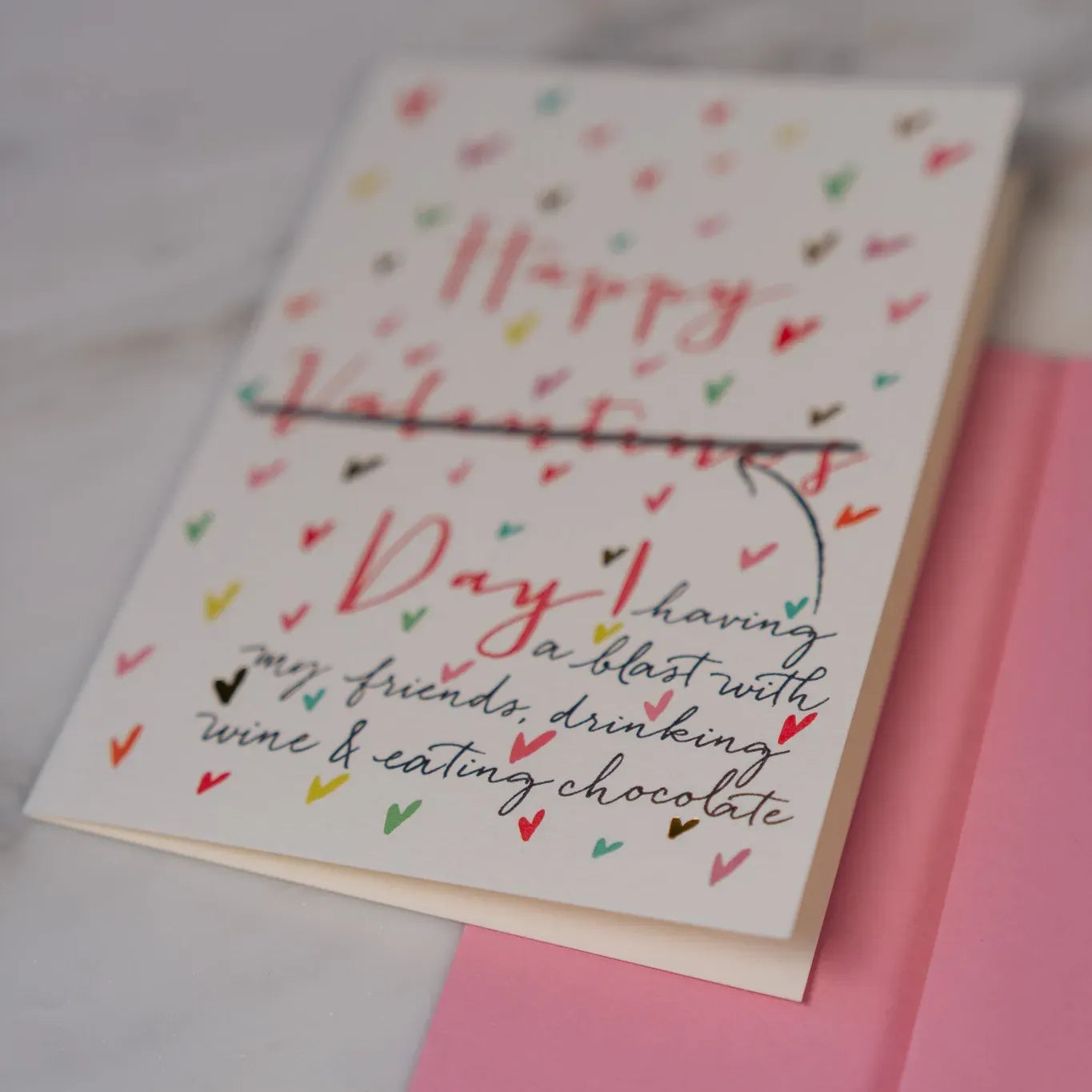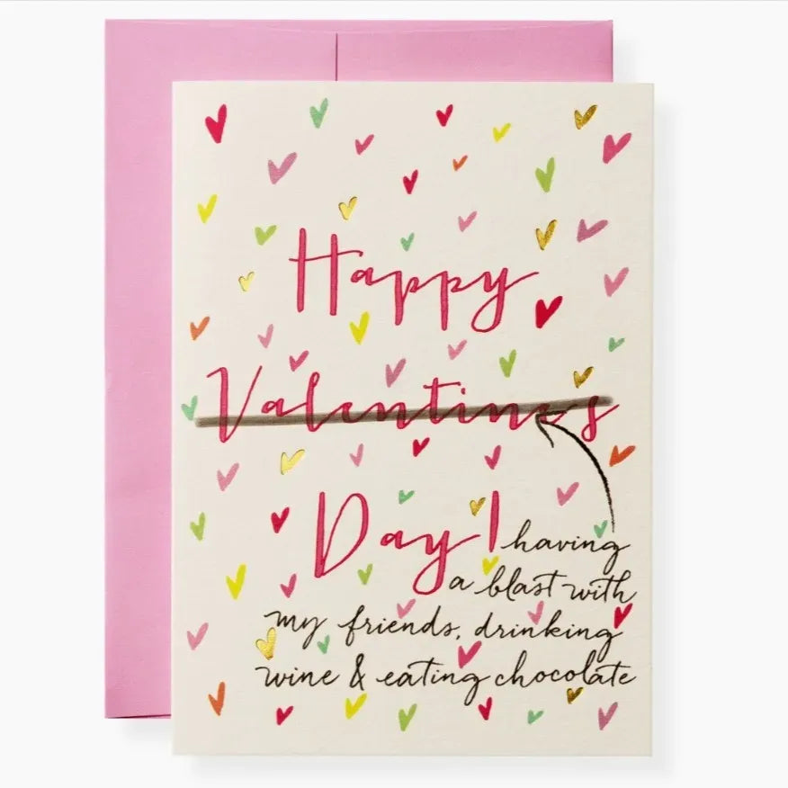 Our Anti-Valentine's greeting card is printed and foiled on natural white paper, letterpress printed in gold foil, and paired with a pink envelope. Book folded card, blank on the inside.