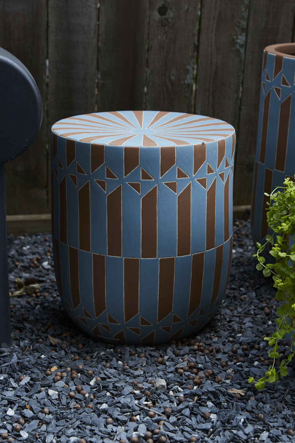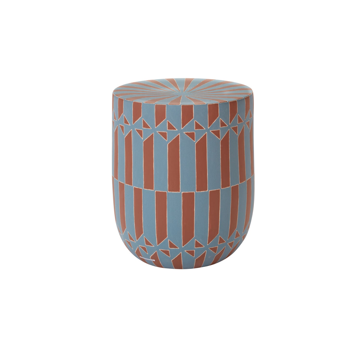 Give your patio a modern, bold lift with the etched & painted geometric designs of the circular Kaleidoscope Stool. The tile-like, alternating blue & terracotta pattern offers a sense of peace & relaxation while providing a versatile pop of color. Made from white clay, this playful piece is perfect for use as a side table or plant stand in temperate outdoor weather, but we recommend bringing it indoors during winter to protect the ceramic.