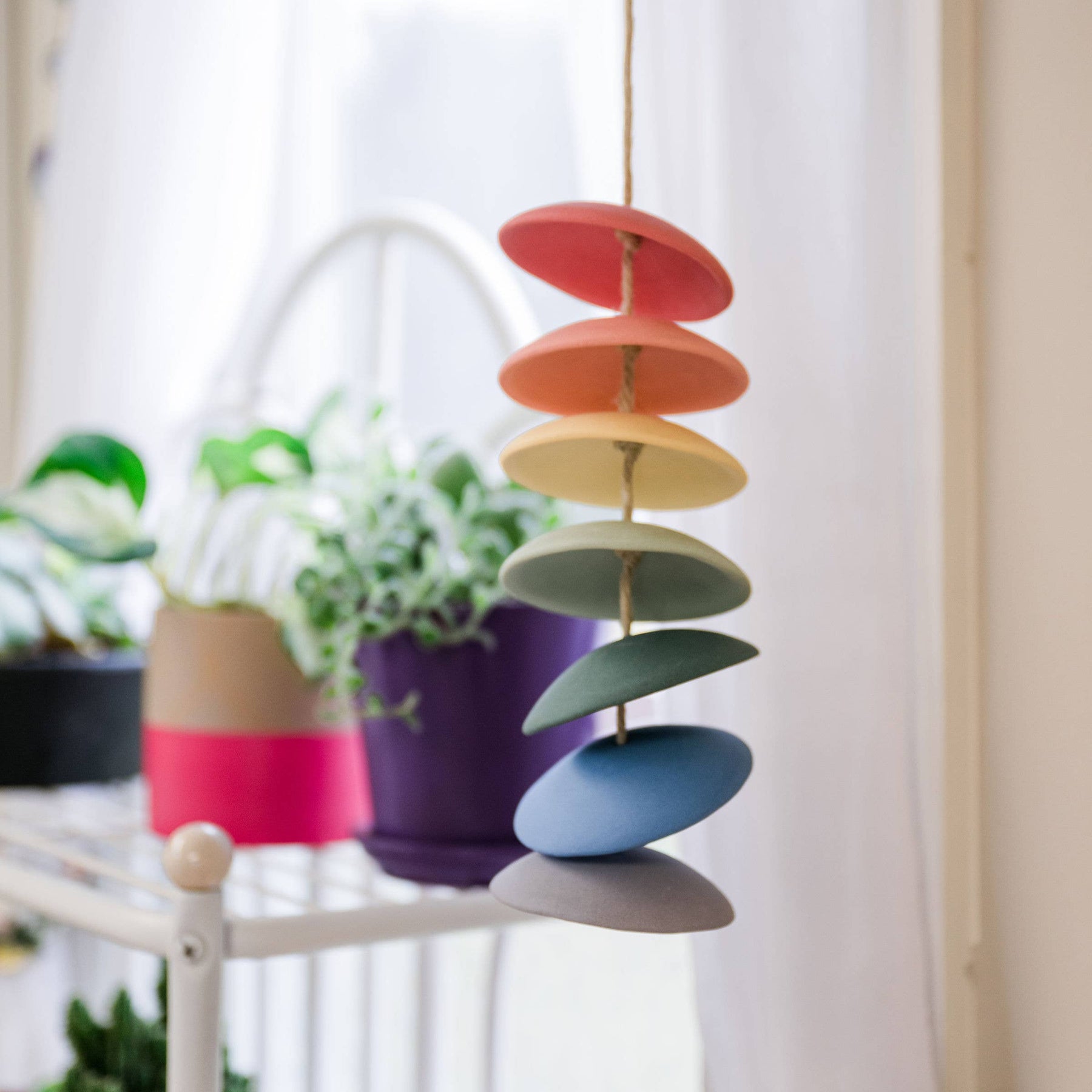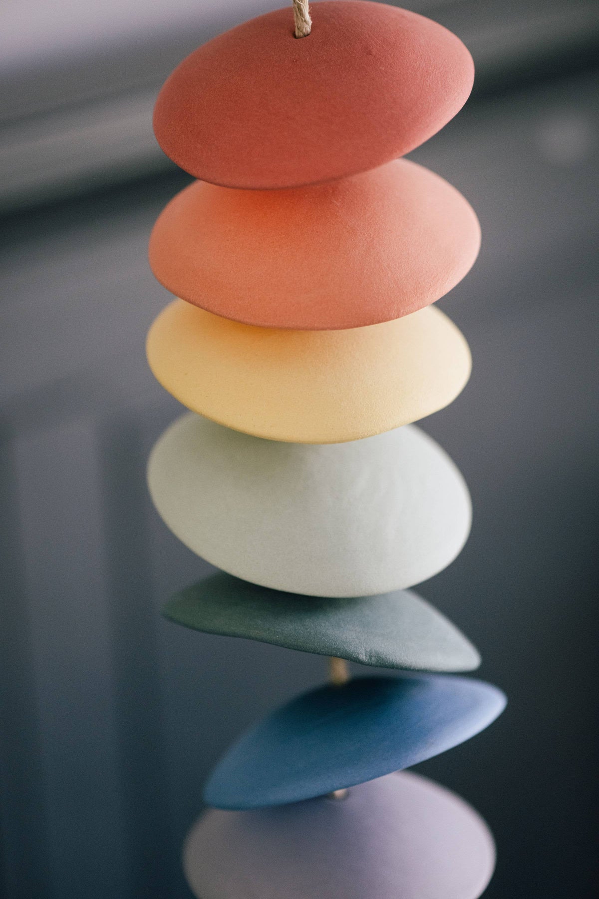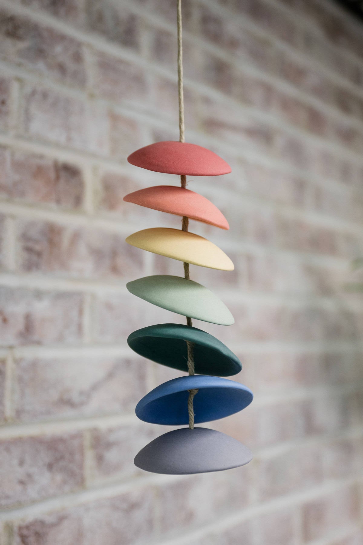 Our most-requested chime strand is now available as an official listing. Made from richly pigmented stoneware and fired to 2232 degrees, each piece is hand-formed and strung to move gently in the breeze. For a soft clink of sound, hang multiple strands close enough to connect.