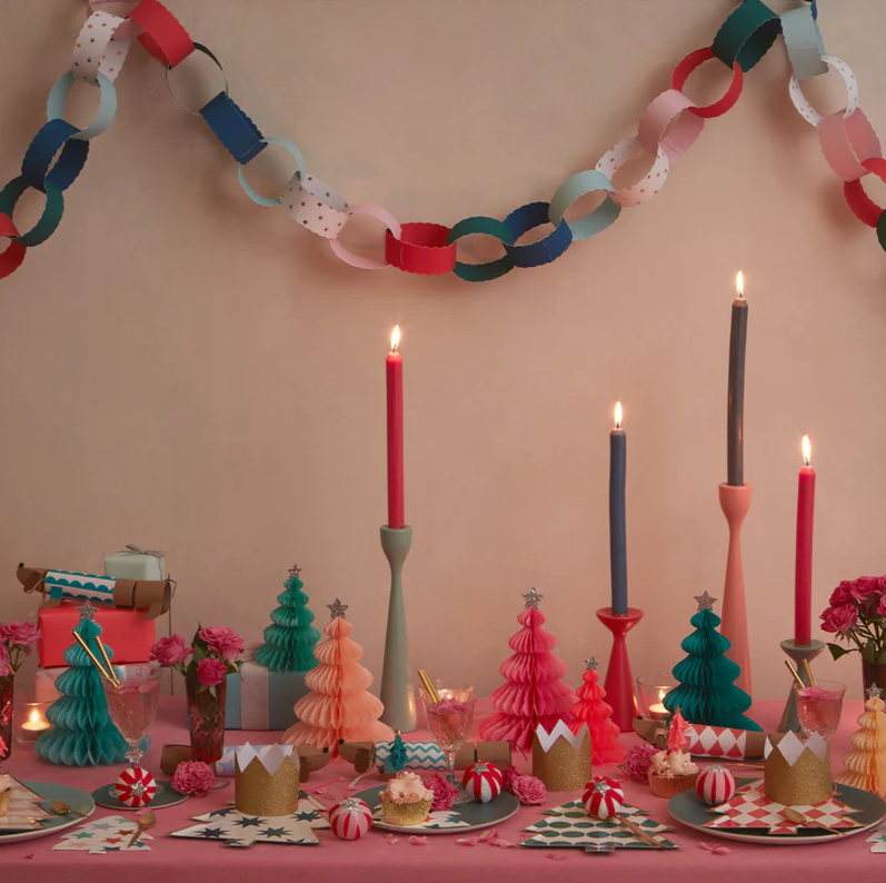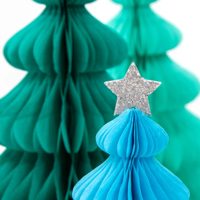 These honeycomb trees make beautiful decorations to place on your party table or around your home. They are crafted from tissue paper and are each topped with a star sprinkled with shiny silver plant based glitter.
