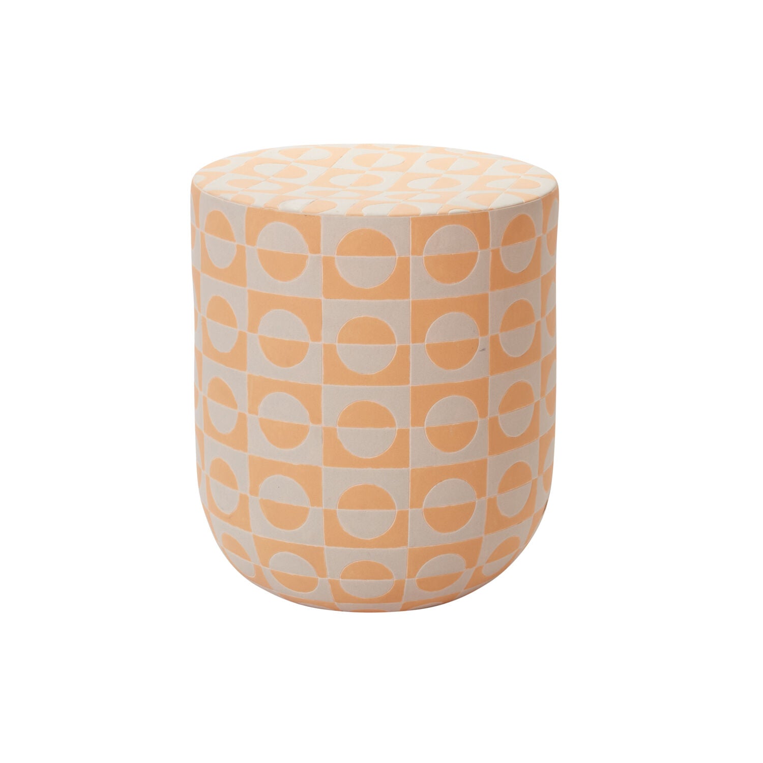 Brighten up your patio with the urban, chic look of the etched & painted circular Sun Dial Stool. The tile-like, geometric, yellow & white textured pattern is inspired by a sunset or sunrise & adds a versatile, optimistic pop of color to any space. Made from white clay, this playful, pleasant piece is perfect for use as a side table or plant stand in temperate outdoor weather but we recommend bringing indoors during winter to protect the ceramic.